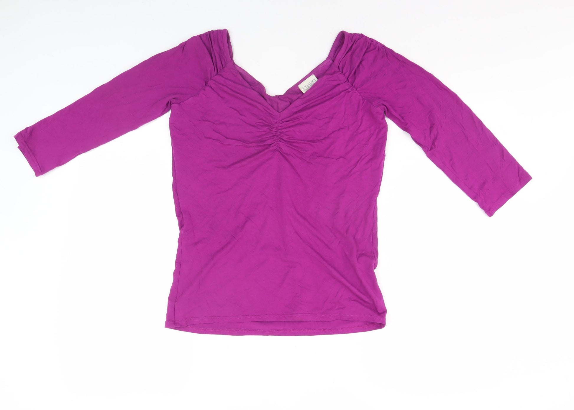 Discover the elegance of the Kaliko Women's 3/4 Sleeve Purple Top, perfect for adding a splash of colour to your wardrobe. Designed from a soft blend of viscose and elastane, this top offers a comfortable stretch and flattering fit, making it an ideal choice for both casual and semi-formal occasions. The rich purple hue brings a vibrant touch, while the solid pattern offers versatility, allowing you to pair it with a variety of bottoms. Featuring a stylish V-neckline and 3/4 sleeves, this garment provides a classic silhouette that complements different body types. Its lightweight material makes it suitable for both spring and autumn seasons. Simply wear it under a jacket for an elevated office look or pair with your favourite jeans for a chic casual outing. Despite being in excellent condition with slight wrinkles, its machine washable fabric ensures easy garment care, making it a practical addition to your wardrobe. Embrace the unique charm and quality of Kaliko with this lovely top. A fantastic find for anyone seeking comfort and style without compromise.