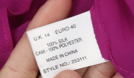 Elevate your wardrobe with this elegant Kaliko blouse, perfect for both casual and sophisticated occasions. Crafted from luxurious silk with a lovely polyester cami, this piece ensures a comfortable and breathable fit. The rich purple hue adds a pop of colour to any ensemble, while the flared sleeves enhance its feminine charm. Featuring a subtle round neckline and delicate button accents, this blouse is versatile enough to pair with jeans for a relaxed look or with a skirt for a more polished approach. Despite slight wear at the hem, the condition remains excellent, offering a great opportunity for style-conscious shoppers. With its solid pattern and classic design, this blouse is suitable for all seasons, making it a timeless addition to your collection. Don't miss out on making this beautiful piece a staple in your fashion lineup.