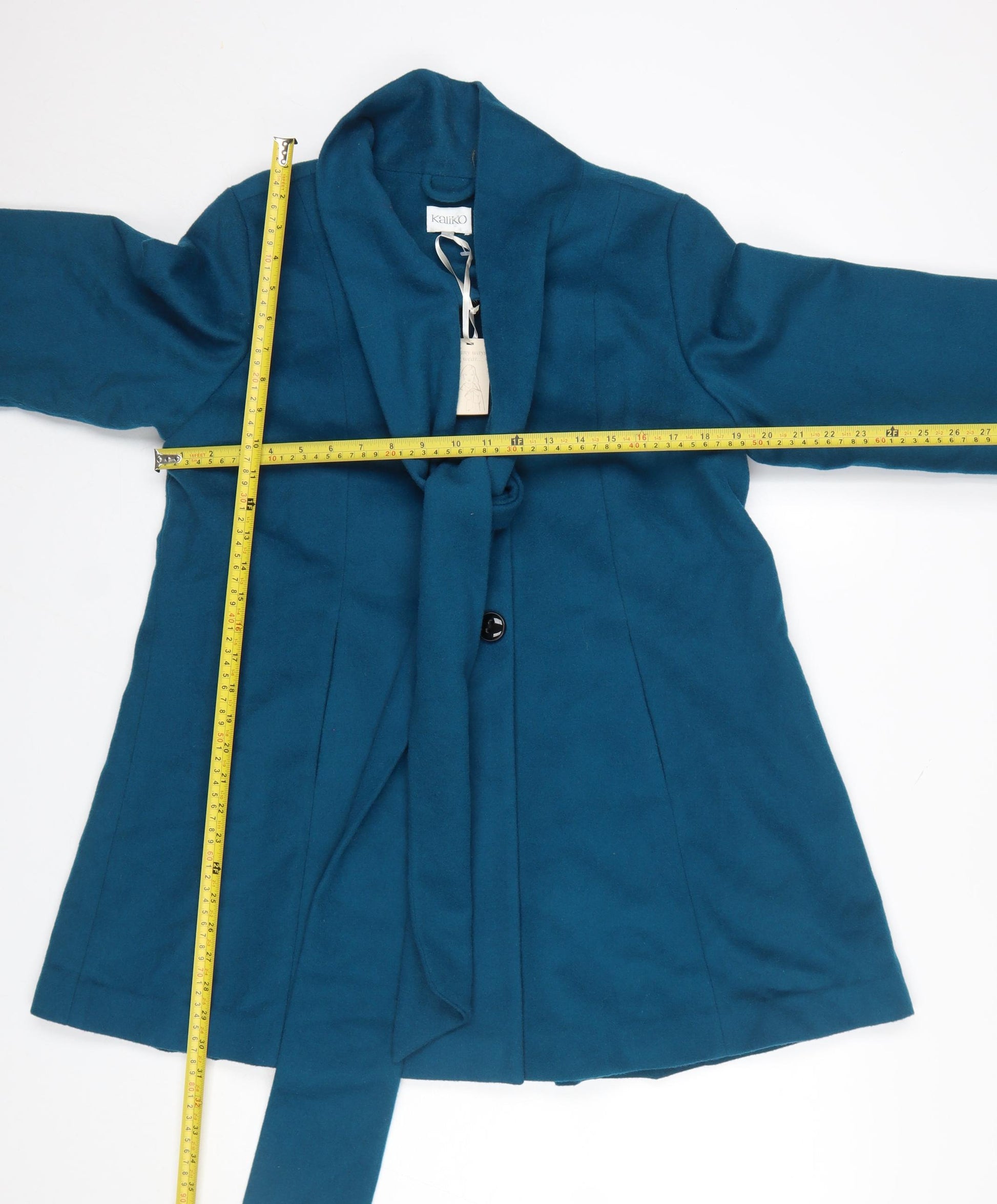 This elegant Kaliko Women's Teal Wool Blend Coat in size 12 is a timeless addition to your wardrobe, perfect for cooler seasons. Crafted from a high-quality blend of 60% wool and 40% polyester, the outer shell offers warmth, durability, and a beautifully soft texture. The coat is fully lined with a comfortable mix of polyester and spandex to ensure a smooth fit and ease of movement, making it an excellent choice for everyday wear or business occasions. This mid-length overcoat features a classic, flattering silhouette that falls just below the hip, offering both shape and comfort. It includes a stylish self-tie fabric belt that cinches at the waist for definition, along with a smart collar that enhances its sophisticated look. The design includes button fastening down the front and gentle seam detailing that creates a tailored finish. The refined teal colour provides a versatile and elegant pop of tone that complements any outfit, whether layered over casual jeans or an office ensemble. Ideal for autumn and winter, this well-structured coat provides warmth without bulk, ensuring both style and practicality. Its minimalist design and classic cut give it a timeless appeal that can transition from day to evening effortlessly. The Kaliko brand is known for its refined, feminine pieces and expert craftsmanship, and this piece reflects that perfectly. With its luxurious wool blend fabrication, chic structure, and sophisticated tone, this Kaliko coat is a must-have for a polished, contemporary wardrobe. Perfect for women seeking effortless elegance with quality tailoring and versatility, it’s a coat that combines comfort, function, and fashion in one beautifully made piece. Whether for work, travel, or smart casual events, this coat adds class and confidence to your outerwear collection.