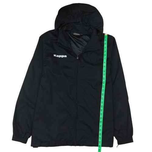 This Kappa men's black windbreaker jacket is a sleek and functional addition to any casual sportswear wardrobe. Crafted entirely from durable nylon, it offers a lightweight yet protective layer ideal for active or everyday wear. The jacket features a practical full-zip closure, adjustable hood and elasticated cuffs for a secure and comfortable fit. The outer shell, also made from nylon, ensures excellent windproof and water-resistant qualities, making it suitable for unpredictable weather during spring and autumn.Designed in a regular fit, this mid-length jacket balances comfort and mobility, perfect for outdoor training, walking, or commuting. The clean black colourway is accented with the iconic Kappa logo printed on the chest, lending a sporty and stylish look. Two zipped hand pockets provide added practicality for carrying essentials or keeping hands warm on cooler days.The nylon lining enhances durability and comfort, while the breathable material keeps the wearer comfortable during physical activity. Versatile in use, it transitions easily from gym sessions to casual outings, ensuring effortless everyday style. The design features a stand-up collar with a hood for extra weather protection, and the overall build reflects Kappa’s signature blend of sport and fashion.This pre-owned jacket remains in excellent condition with only minimal signs of previous wear and no visible damage or flaws. It would make an ideal choice for men seeking functional outerwear that combines athletic performance with a classic clean look.Overall, this Kappa jacket pairs well with sports gear, jeans, or track pants for a comfortable and confident everyday ensemble. Whether for training, travel, or casual workwear, it brings versatility, lightweight comfort and durable Kappa quality to any wardrobe.