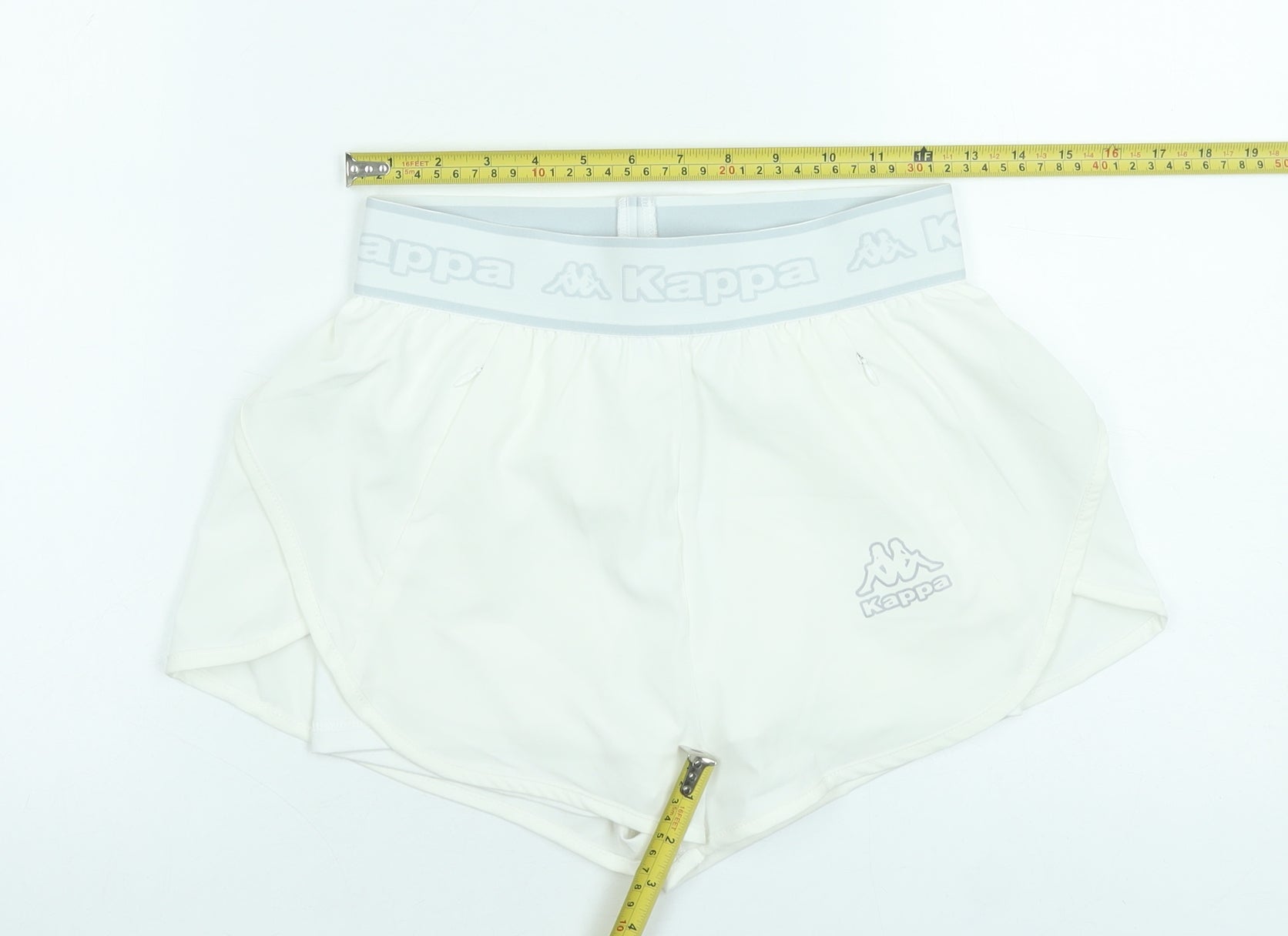 Step into comfort and style with these Kappa x Primark Women’s White Athletic Shorts in size XS. Designed with sporty aesthetics and everyday functionality in mind, these shorts combine the iconic Kappa branding with the affordability and modern style of Primark. The lightweight microfibre fabric blend ensures smooth movement and excellent breathability, perfect for keeping cool and comfortable during workouts or relaxed days out. Made from 90% polyester and 10% elastane, the fabric offers flexibility and resilience, making it ideal for running, gym sessions, yoga, or casual wear. The elasticated waistband, printed with a subtle Kappa logo, provides a secure yet gentle fit that moves with your body. These shorts are cut in an athletic silhouette with a slightly curved hem for a flattering and sporty style, enhancing mobility and layering comfort. The clean white shade makes them a versatile wardrobe essential, pairing seamlessly with crop tops, T-shirts, or sports bras. Easy to maintain and machine washable, they combine easy care with durability. Perfect for spring and summer, these shorts are the ideal blend of performance and style, offering dependable comfort whether you’re training, lounging, or on the go. A must-have piece for the modern activewoman.