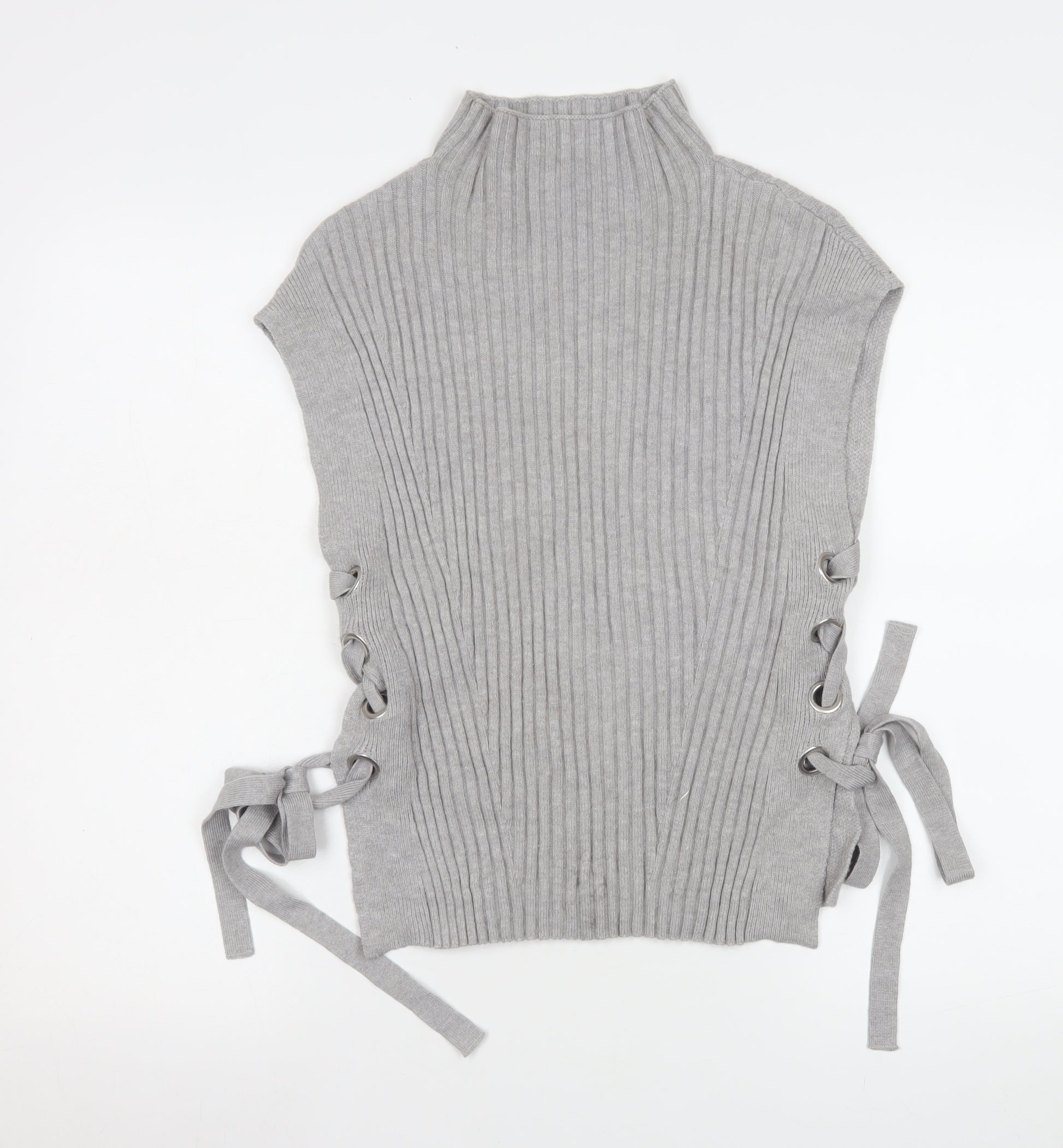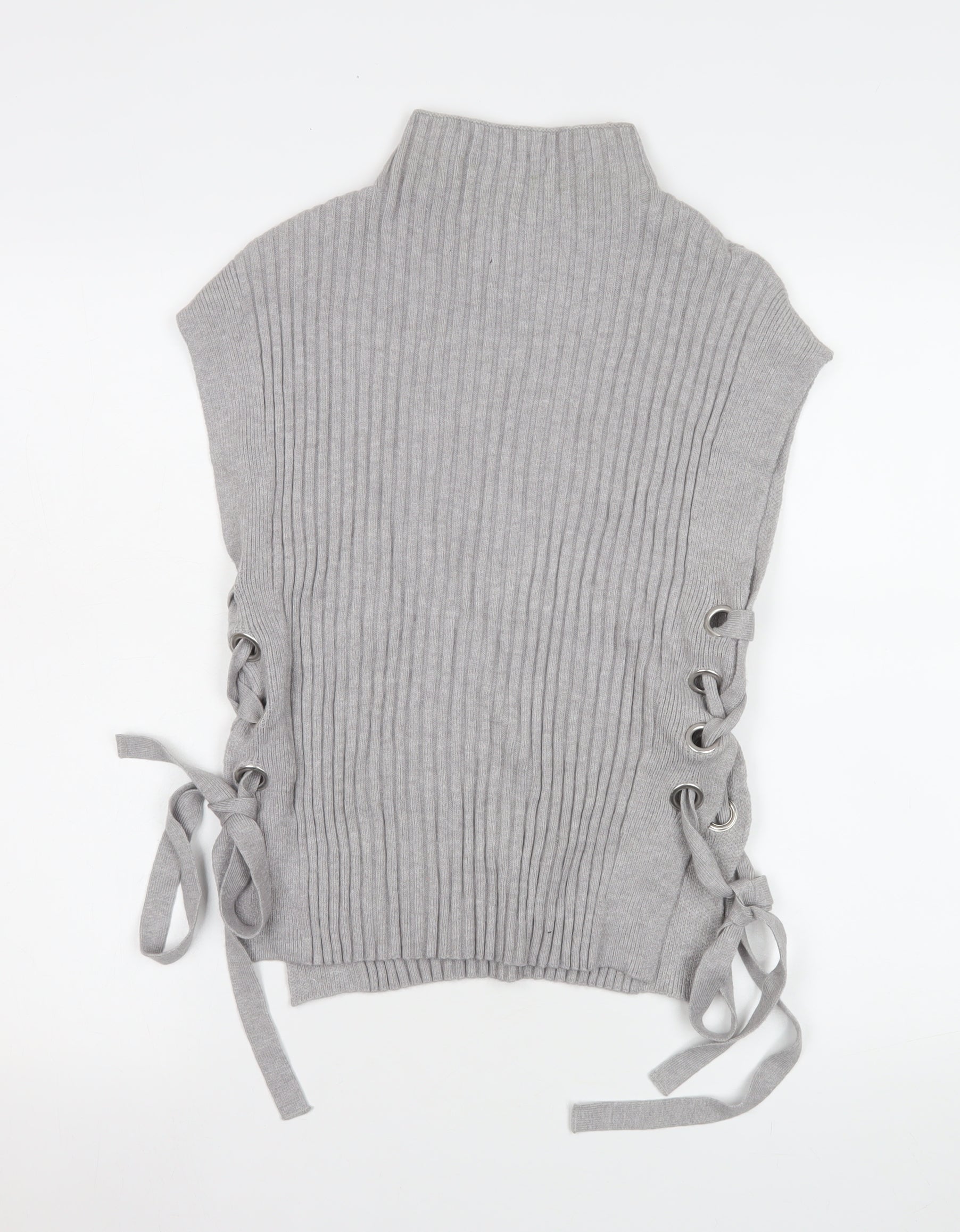 Womens Grey Sleeveless Knit High Neck Lace Up Blouse Size S