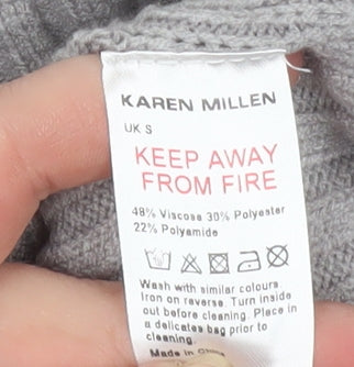 Add effortless sophistication to your wardrobe with this Karen Millen women’s grey sleeveless knit blouse. Crafted from a soft and comfortable blend of viscose, polyester, and polyamide, the fabric offers a luxurious yet breathable feel ideal for layering seasonally. The finely ribbed knit texture gives a figure-flattering silhouette, while the lace-up detailing on both sides adds a chic, feminine touch that elevates this versatile piece from simple to standout. Designed in a high neck style, this top provides a polished look perfect for both work and leisure, blending elegance with comfort seamlessly.The sleeveless cut ensures freedom of movement and makes it suitable for autumn and winter layering, whether paired with a blazer for the office or styled alone with tailored trousers or a skirt for evenings. The soft-grey shade is timeless and coordinates easily with both neutral and colourful outfits, ensuring it becomes a staple go-to top. The fitted shape flatters the waist and shoulders, and the comfortable stretch fabric ensures an easy, flattering fit for everyday wear.The blouse is in excellent pre-owned condition with no visible flaws or marks. Machine washable for convenient care, this Karen Millen top combines luxury quality with practicality and durability. Its lace-up sides add subtle definition, while the ribbed knit helps maintain shape over time. Stylish yet simple, this beautiful piece reflects Karen Millen’s commitment to polished, modern design — perfect for women who value style and comfort. A superb choice for layering during cooler months or wearing solo for contemporary elegance, it’s a versatile wardrobe hero that’s both classic and effortlessly chic.