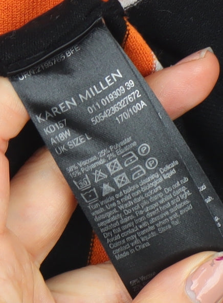 This Karen Millen women’s long sleeve top brings bold colour and refined comfort together for an effortlessly stylish look. Crafted from a soft, stretch-knit blend of viscose, polyamide, polyester, and elastane, it offers both breathability and shape retention. The design features vibrant horizontal stripes in black, orange, red, blue, and white, arranged in wide bands for a striking, modern appearance. With its classic crew neckline and fitted silhouette, this top combines everyday versatility with the high-quality finish Karen Millen is known for.Perfect for layering during cooler months or wearing alone in transitional weather, this top’s lightweight knit makes it a great choice for autumn and winter styling. The slim yet comfortable fit ensures it pairs easily with tailored trousers, jeans, or skirts, adapting seamlessly from casual daytime outings to smart-casual workwear looks. The craftsmanship and material composition deliver a soft feel on the skin while maintaining durability and flexibility with wear.In excellent pre-owned condition, this long sleeve knit shows only light signs of use with no visible damage or fabric flaws. Machine washable and easy to care for, it’s a practical and stylish addition to any wardrobe. Ideal for women who appreciate structure, quality, and colour-based statement pieces, this Karen Millen striped knit top adds a pop of personality without compromising on elegance. Whether styled with classic denim for a relaxed weekend or tucked into a pencil skirt for a polished office ensemble, this versatile top will become a go-to favourite. A must-have for anyone looking to refresh their collection with a timeless yet contemporary knitwear piece.