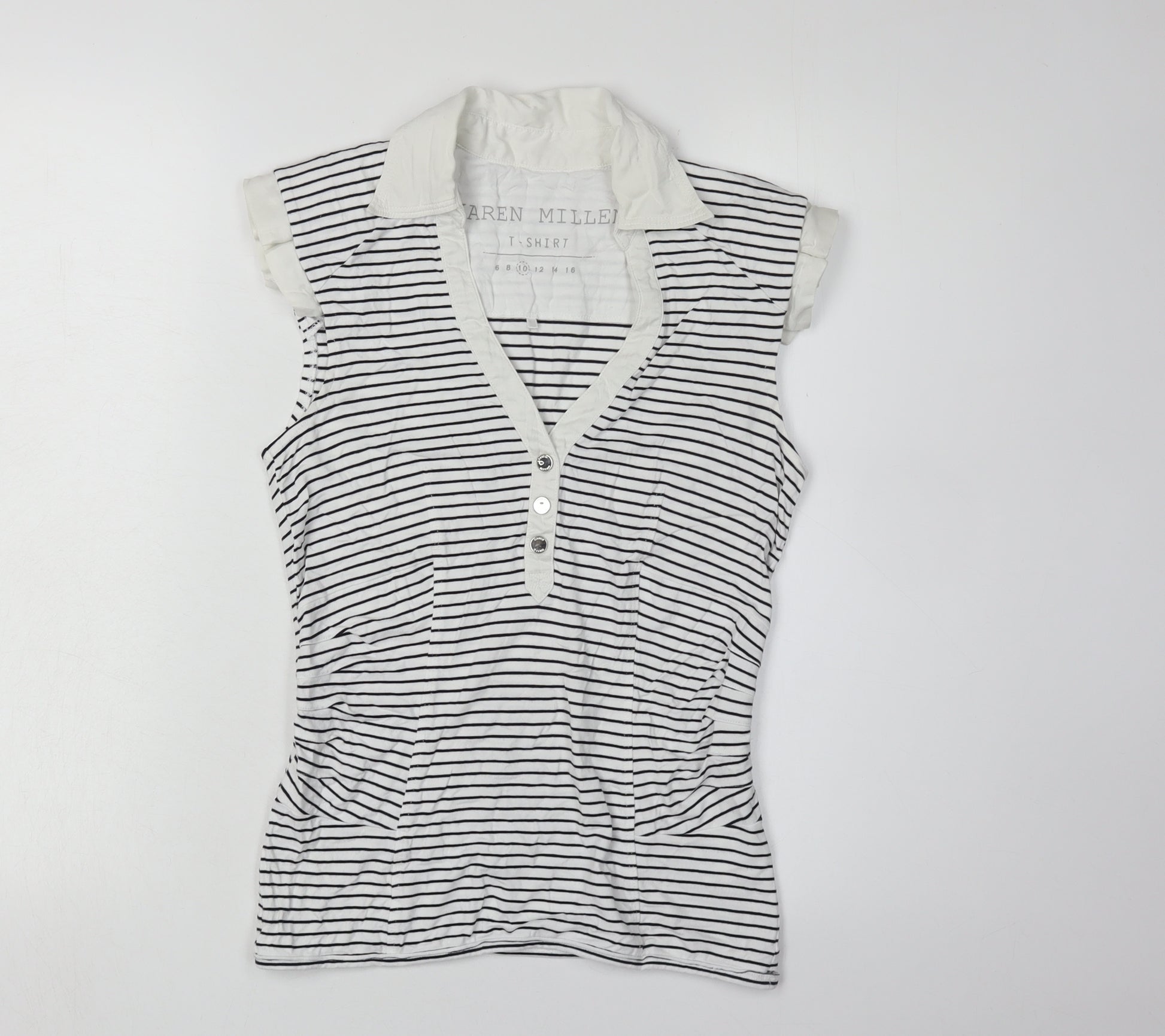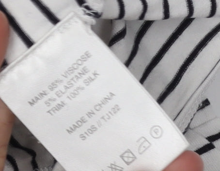 This Karen Millen women's sleeveless T-shirt is the perfect blend of style and comfort for everyday casual wear. Designed with a striking black and white striped pattern, this top brings a modern edge to a classic look. The collared neckline and button accents add an element of sophistication, making it suitable for a relaxed day out or a casual office setting. Crafted from a soft 85% viscose and 5% elastane fabric, it offers a comfortable stretch fit that moves with you. Its slim fit silhouette is flattering and easy to layer under jackets or cardigans for cooler days. The top's lightweight material makes it ideal for summer, keeping you cool and stylish with every wear. Easy to care for, simply machine wash and wear, ideal for the busy modern woman. With its excellent condition and no visible signs of wear, this T-shirt promises both quality and elegance, perfect for those who appreciate a polished yet effortless look. Embrace a chic and versatile addition to your wardrobe with this Karen Millen piece that ensures you'll look great no matter the occasion.