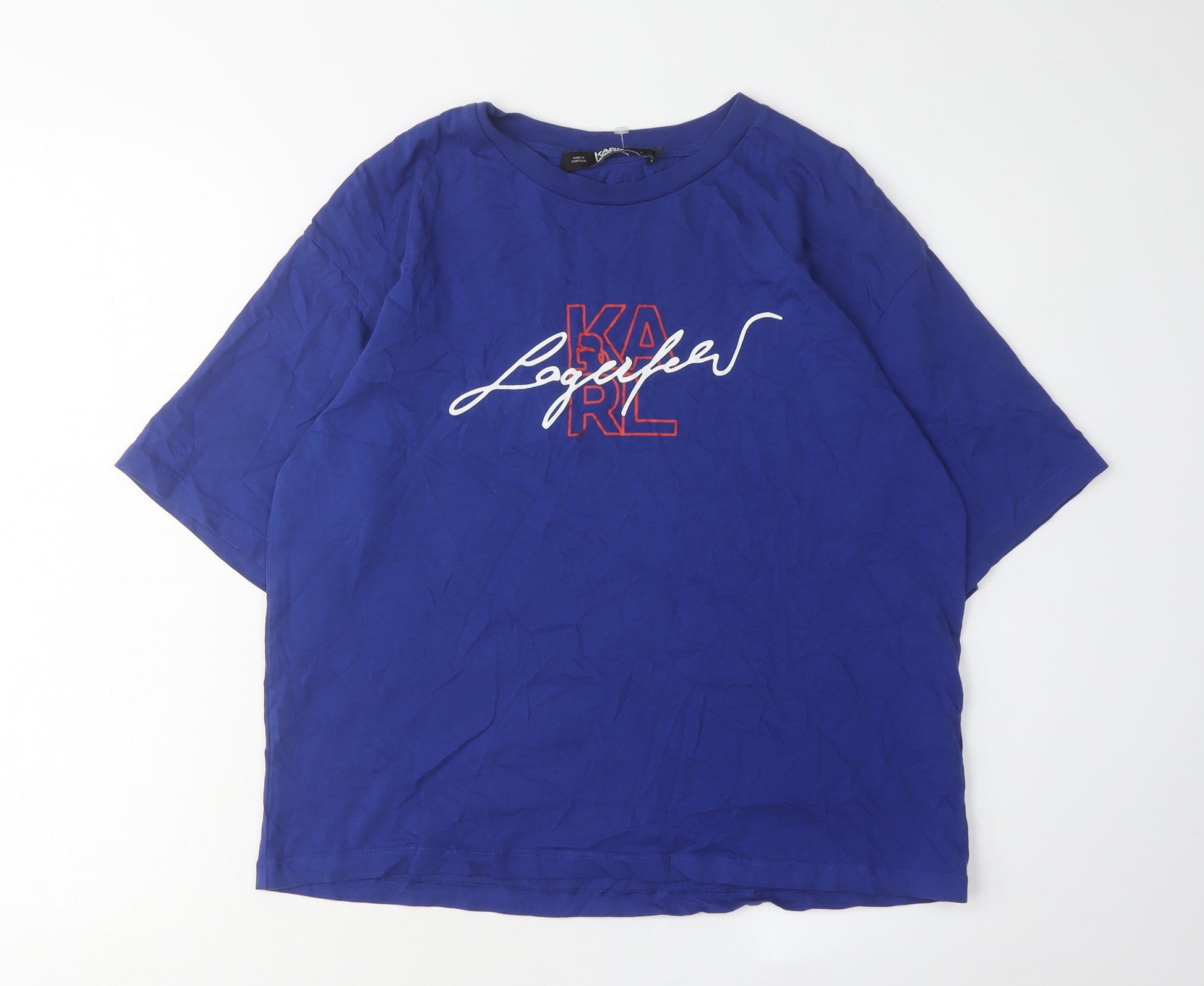 Introducing the Karl Lagerfeld Women's T-Shirt in a striking blue shade, perfect for casual outings and adding a touch of designer flair to your wardrobe. This classic medium-sized tee, made from 100% cotton, promises comfort and a soft touch against your skin, ensuring you stay cool and relaxed wherever you go. The embroidered Karl Lagerfeld signature on the front gives this T-shirt a unique and sophisticated touch, marking it as a staple for fashion-forward women. The short sleeves make it ideal for warmer seasons, while the pullover style ensures ease of wear. With a comfortable round neckline, this piece is perfect for layering or wearing on its own. Despite being pre-owned, this T-shirt is in excellent condition, with no visible damage though slightly wrinkled, giving it a lived-in, stylishly relaxed look. Great for casual wear, outings, or simply flaunting your appreciation for high fashion, this blue tee is versatile and chic. Pair it with jeans, skirts, or under a blazer to create an effortlessly stylish outfit. Add this unique piece to your collection today and embrace the elegance of Karl Lagerfeld's design. Grab this opportunity to own a piece from a renowned designer at an attractive price.