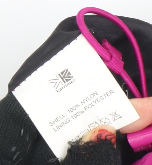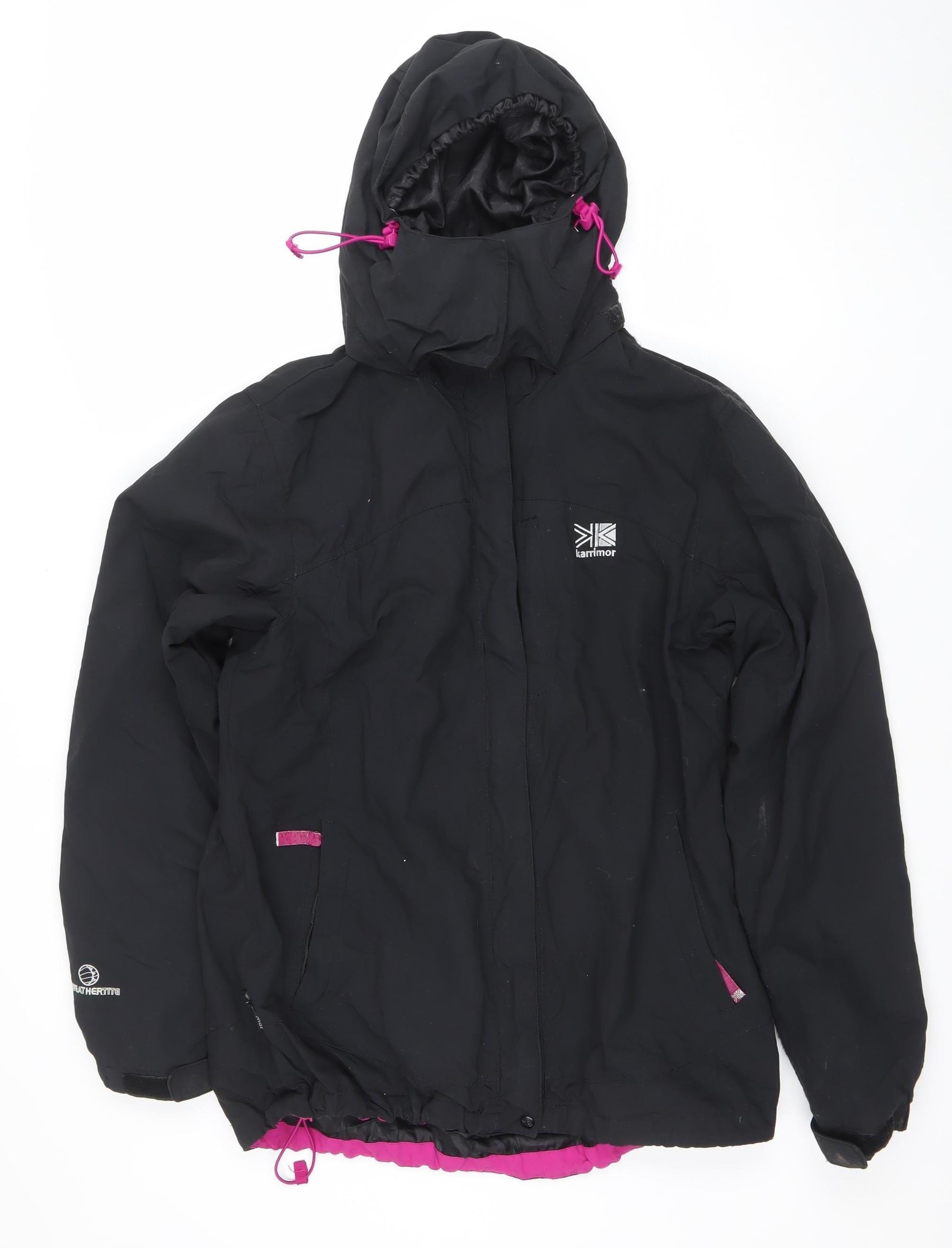 Stay ready for any adventure with this women’s Karrimor waterproof rain jacket in classic black. Designed by the renowned British mountain brand, this jacket offers dependable protection against the elements without compromising comfort or style. Crafted from 100% nylon for a durable outer shell and lined with 100% polyester, it provides a lightweight yet secure barrier that helps keep you dry and comfortable during outdoor pursuits. The full-zip front and adjustable drawcord hood ensure a snug fit, while zipped pockets add functional storage for essentials when on the move. Featuring pink contrast drawcord details for a subtle pop of colour, this mid-length jacket is ideal for year-round outdoor wear, especially during the cold and rainy seasons. Its softshell feel and breathable weave make it great for walking, hiking, camping or everyday use. The reflective Karrimor logo adds an extra touch of safety and brand authenticity. This jacket is versatile enough to pair with outdoor trousers or your favourite jeans, blending practicality with a sporty, modern look. With light marks and gentle signs of wear that do not detract from its utility or appearance, it remains in good used condition and ready for its next adventure. Easy to care for and machine washable, this women's Karrimor rain jacket is a functional, affordable wardrobe essential for anyone who loves outdoor activities or needs a reliable layer against unpredictable UK weather. Sized at a UK 12 and tailored for a regular fit, it offers unrestricted comfort for an active lifestyle. Don’t miss out on this durable, weather-ready outdoor piece perfect for both autumn and winter adventures.