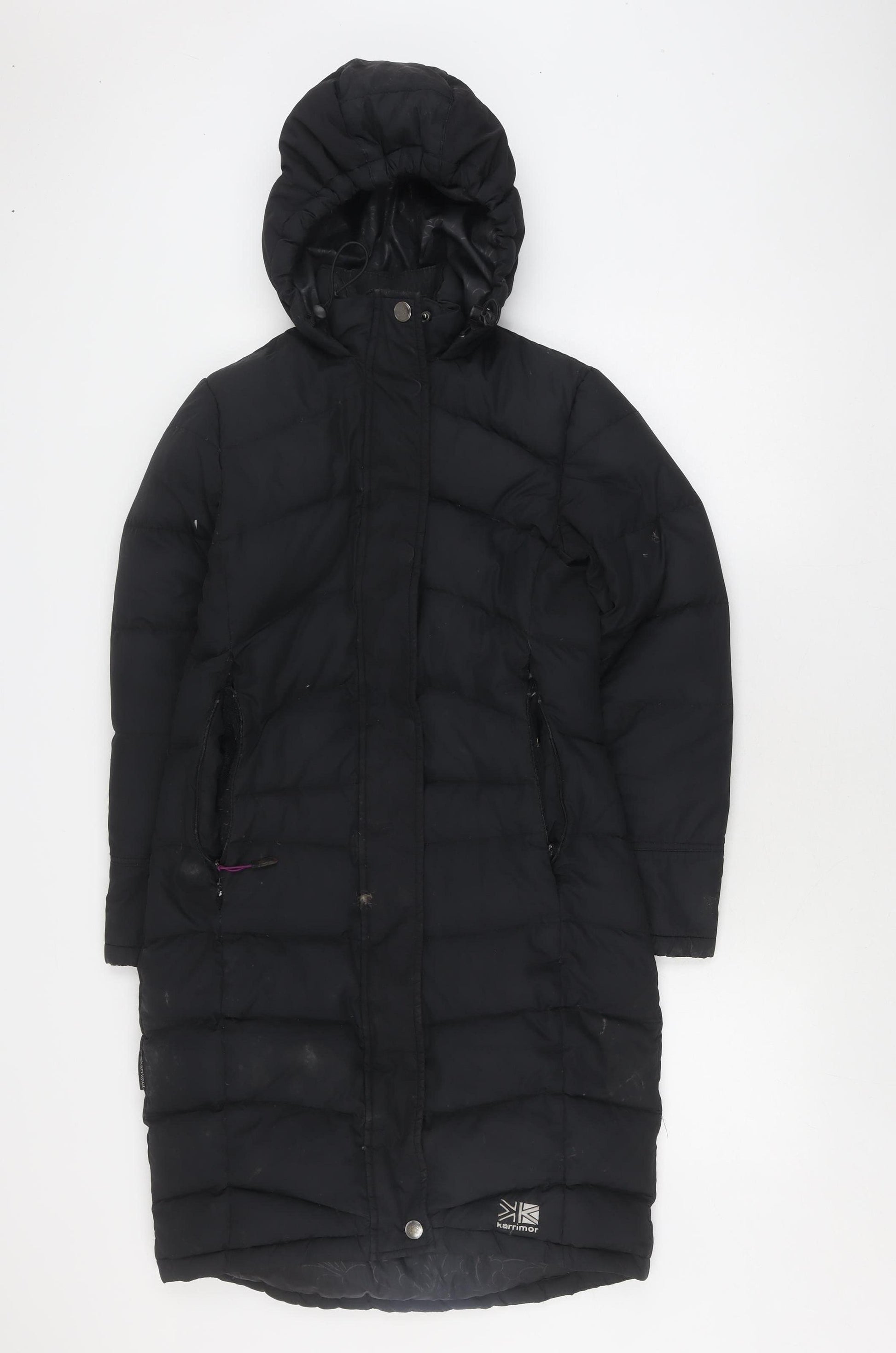 Stay warm and stylish with this Karrimor women's puffer jacket, perfect for winter outings. Made from durable polyester with a cozy down insulation, this black mid-length jacket offers ultimate comfort and protection against the cold. Its hooded design and zipped pockets add functional detail, making it suitable for various outdoor activities. Lightweight and machine washable, this jacket is ideal for everyday casual wear. Although pre-loved, it remains in good condition with light signs of wear, making it an economical yet fashionable choice.