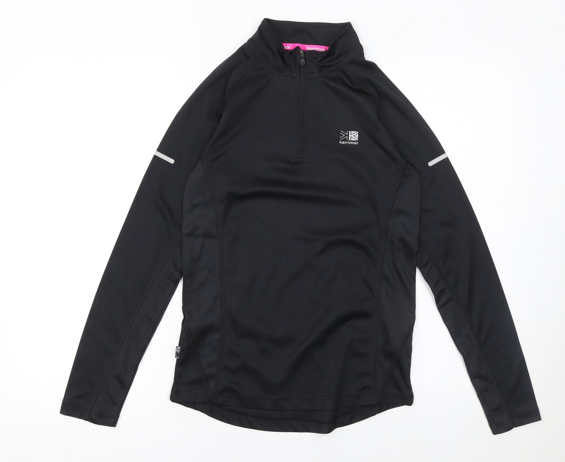 Stay comfortable and confident during your workouts with this Karrimor Women’s Black Long Sleeve 1/4 Zip Running Top. Designed for active lifestyles, this performance piece is crafted from 100% polyester, ensuring it is lightweight, breathable, and quick-drying. The soft yet durable fabric wicks moisture away from your skin to keep you cool and focused, whether you’re jogging outdoors or training in the gym. Cut in an athletic fit, this top flatters your natural shape while allowing unrestricted movement. The high neckline with a quarter-zip fastening gives you flexible ventilation control, while the reflective detailing enhances visibility in low-light conditions — perfect for early morning or evening runs. Raglan sleeves provide comfort and mobility, reducing seam friction during active use.Function meets performance with design features that ensure practicality and lasting comfort. The breathable panels help regulate your body temperature, and stretch construction allows a full range of motion. The smooth polyester finish resists wrinkles and maintains its sleek look even after multiple washes.Finished in solid black with subtle branding and a contemporary style, this Karrimor top is as versatile as it is functional. It pairs effortlessly with leggings, joggers, or shorts, making it suitable for running, gym sessions, hiking, or general fitness training. The long sleeves and quick-drying material make it an excellent choice for the cooler months of autumn, winter, and spring.In excellent pre-owned condition with no visible signs of wear or damage, this top offers exceptional performance and durability at a great price. Perfect for women who want reliable activewear without compromising on style or comfort, it’s a must-have addition to any sportswear wardrobe.Whether you’re training for a marathon or enjoying a weekend hike, this Karrimor 1/4 Zip Running Top will keep you moving with ease, providing outstanding comfort and performance you can rely on.