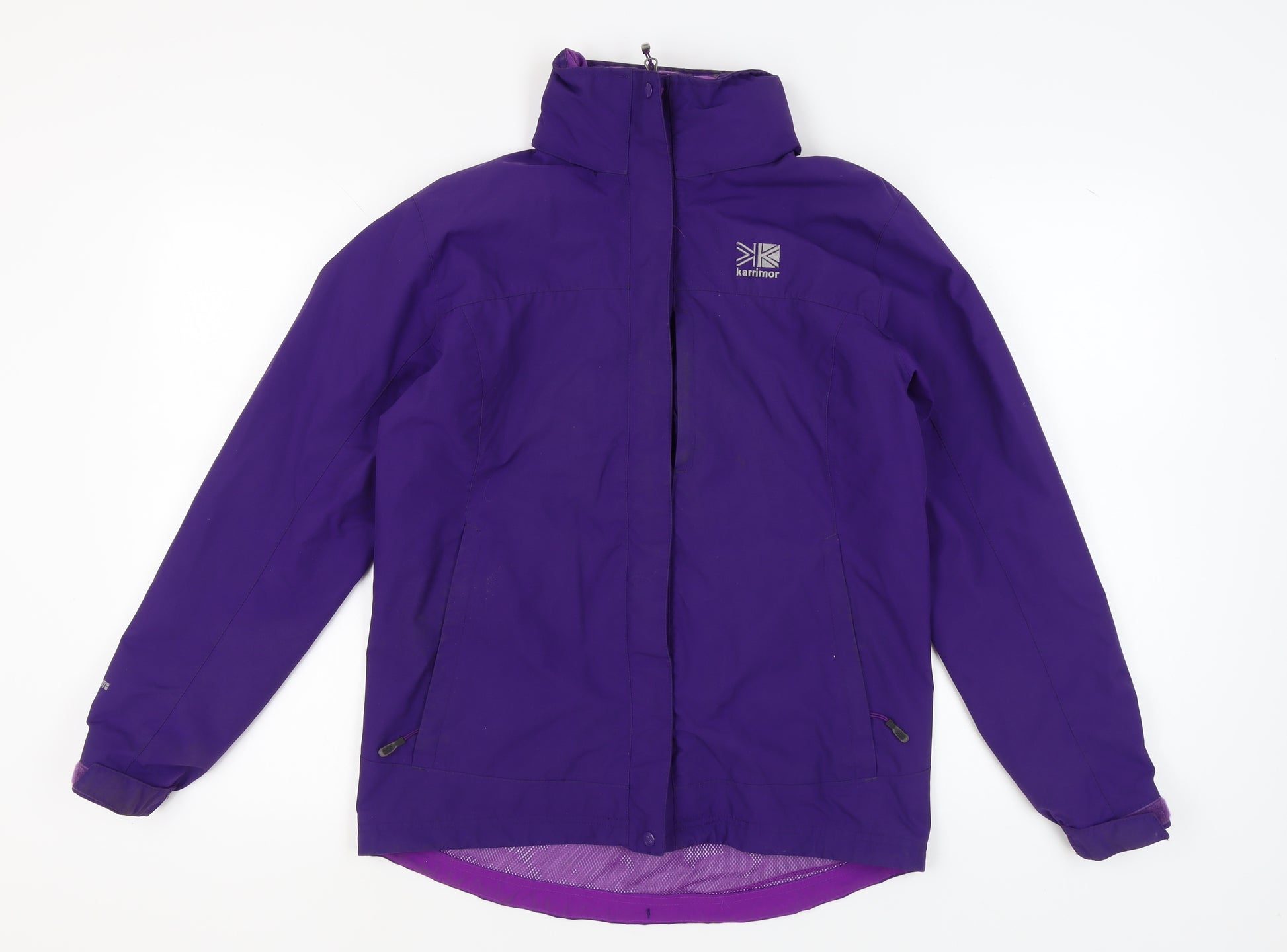 Introducing the Karrimor Women's Purple Waterproof Jacket, a perfect blend of style and functionality ideal for your outdoor adventures. Designed for all seasons, this jacket is constructed with a 100% nylon outer shell, ensuring remarkable durability and waterproof protection against the elements. The vibrant purple hue adds a touch of elegance to your casual or travel outings, making it a must-have in any wardrobe. The jacket features a regular fit and is tailored in a flattering mid-length with long sleeves, providing ample coverage and comfort. With a practical zip closure and zipped pockets, it ensures your essentials are securely stored, while retaining a sleek and streamlined silhouette. The polyester lining enhances your comfort, making it suitable for extended wear. Displaying a subtle logo accent, this jacket embodies both quality craftsmanship and iconic style from Karrimor. Though slightly worn, it’s in excellent condition, ready to accompany you on countless adventures. Machine washable and easy to care for, this jacket is as practical as it is stylish. Whether you're exploring the city or hiking in the hills, the Karrimor Women's Purple Waterproof Jacket is your reliable partner, ensuring you stay dry and stylish. Don't miss out on this versatile piece—its blend of functional elements and chic design will enrich your wardrobe and elevate your outdoor attire.