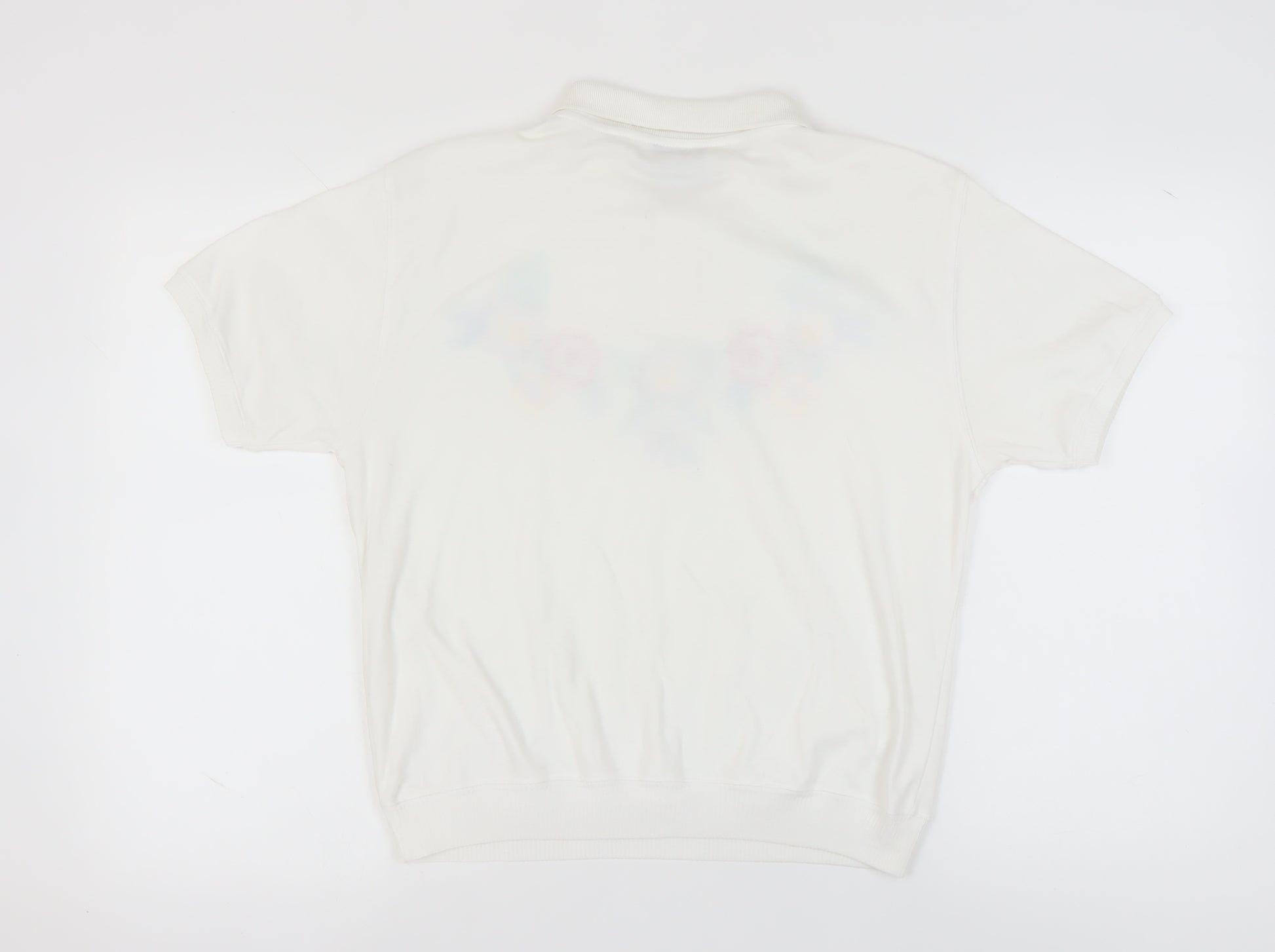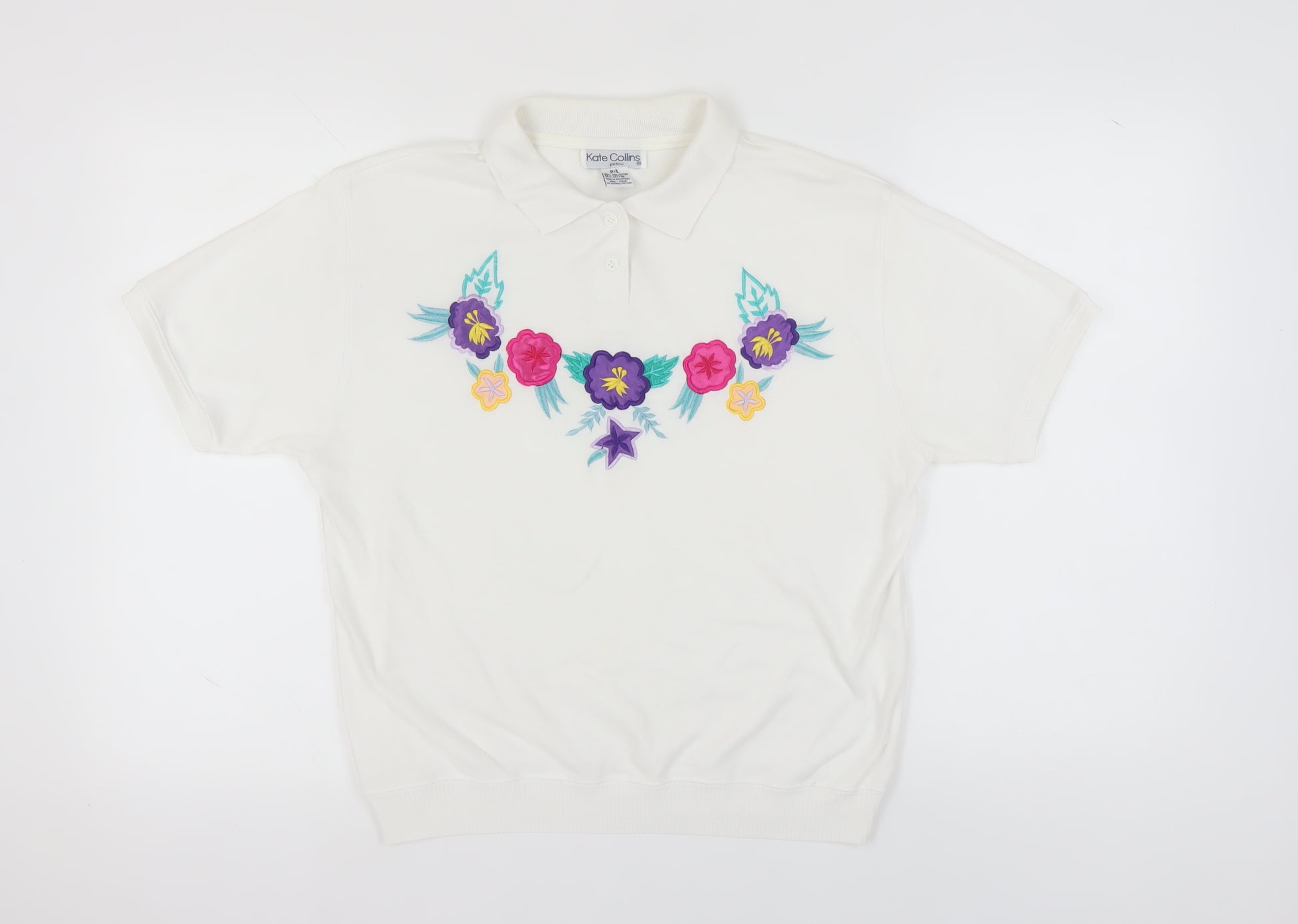 This Kate Collins Women's Polo in a crisp white shade is a perfect blend of style and comfort, making it an ideal choice for casual outings. Crafted from a high-quality mix of 65% polyester and 35% cotton, this polo offers durability and breathability to keep you comfortable throughout the day. The short-sleeved design features a classic collared neckline with button closure, providing a refined touch to this casual piece. The floral embroidery accent adds a dash of elegance and femininity, making it a versatile addition to your wardrobe. This polo is designed for petites, ensuring a perfect fit for a streamlined silhouette. It's machine washable, simplifying garment care. Despite being pre-owned, it remains in excellent condition with no visible damage or signs of wear. Whether you're heading for a casual day out or a relaxed afternoon with friends, this floral-themed polo offers a chic, effortless look. Its elegant design and comfortable fit make it a staple for any fashion-forward woman. Don't miss the opportunity to add this charming piece to your collection.
