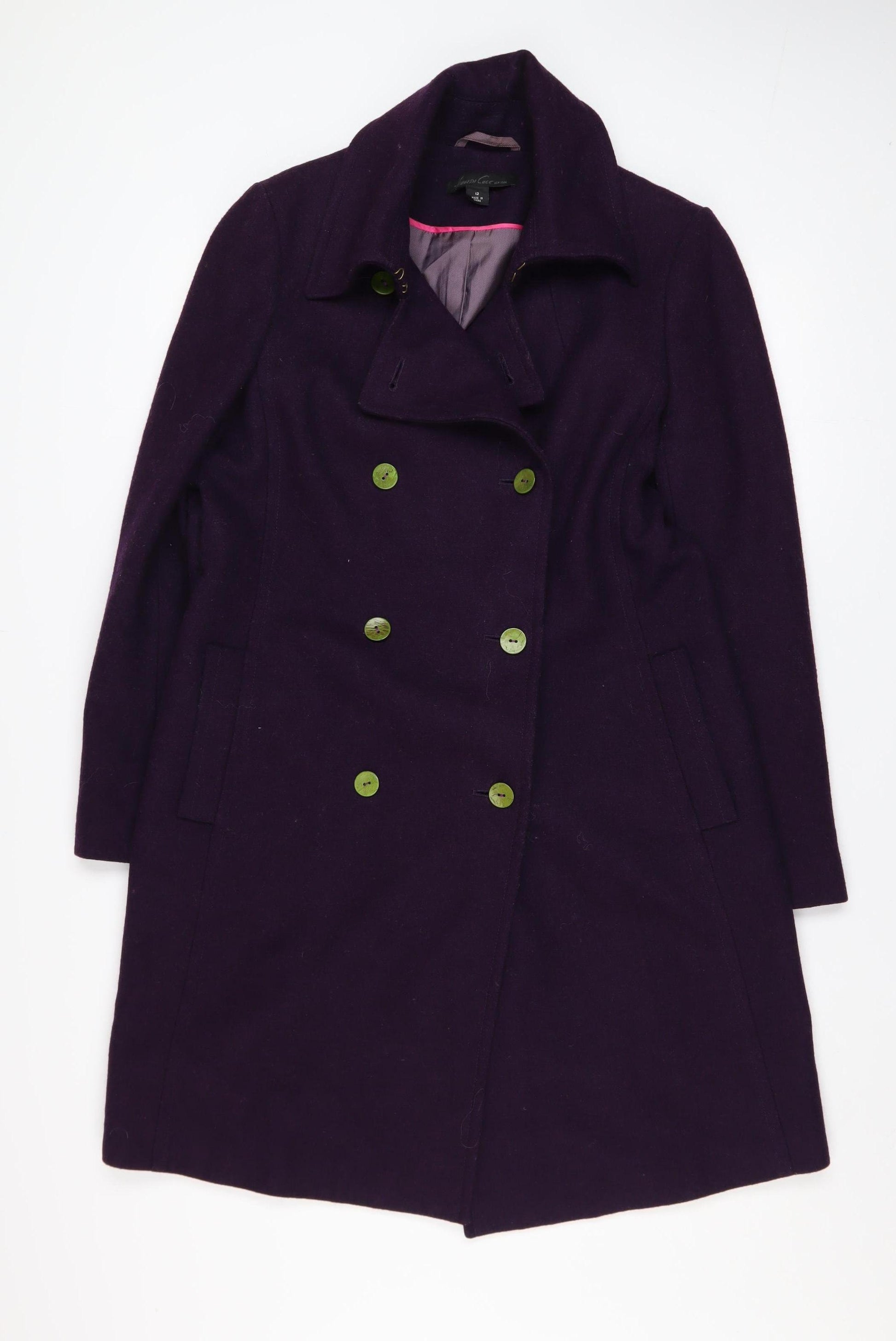 Elevate your outerwear collection with this stunning Kenneth Cole women's purple pea coat, designed to bring timeless sophistication and comfort to your wardrobe. Crafted from a high-quality wool blend, this mid-length coat combines 51% wool with polyester, acrylic, nylon, and viscose, offering both warmth and durability ideal for the autumn and winter seasons. The rich purple tone adds a chic yet versatile touch, perfect for pairing with both smart and casual ensembles. Thoughtfully designed with a tailored silhouette, it flatters the figure while allowing comfortable layering underneath.Featuring a double-breasted button closure with stylish green buttons, this coat brings a hint of unique character to a classic design. It is fully lined with a smooth nylon and acetate blend for ease of movement and lasting comfort. Functional front pockets offer practical storage and convenience, making it as efficient as it is elegant. The long sleeves and structured collar provide additional protection from chilly weather while maintaining a refined look.Ideal for business, casual, or everyday wear, this coat transitions effortlessly from day to night. Whether worn over a dress for a professional setting or layered with jeans and boots for a weekend outing, this Kenneth Cole piece ensures impeccable style and confidence. With light signs of wear and no visible damage, it remains in excellent pre-loved condition, making it an affordable luxury at a fraction of the original price. Add this beautifully tailored wool blend coat to your winter wardrobe and enjoy its enduring quality and elegance season after season.