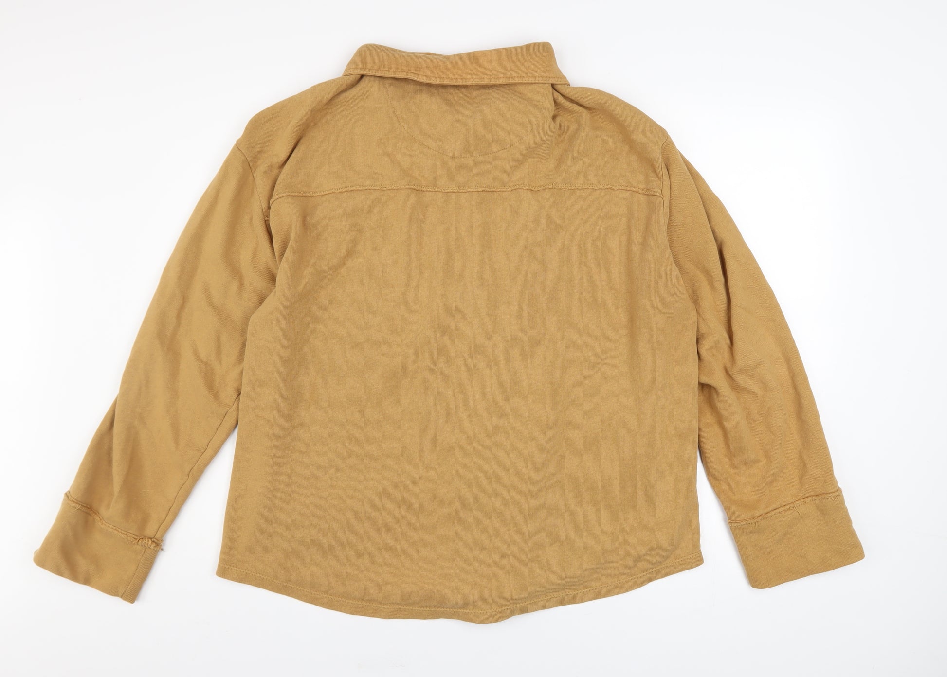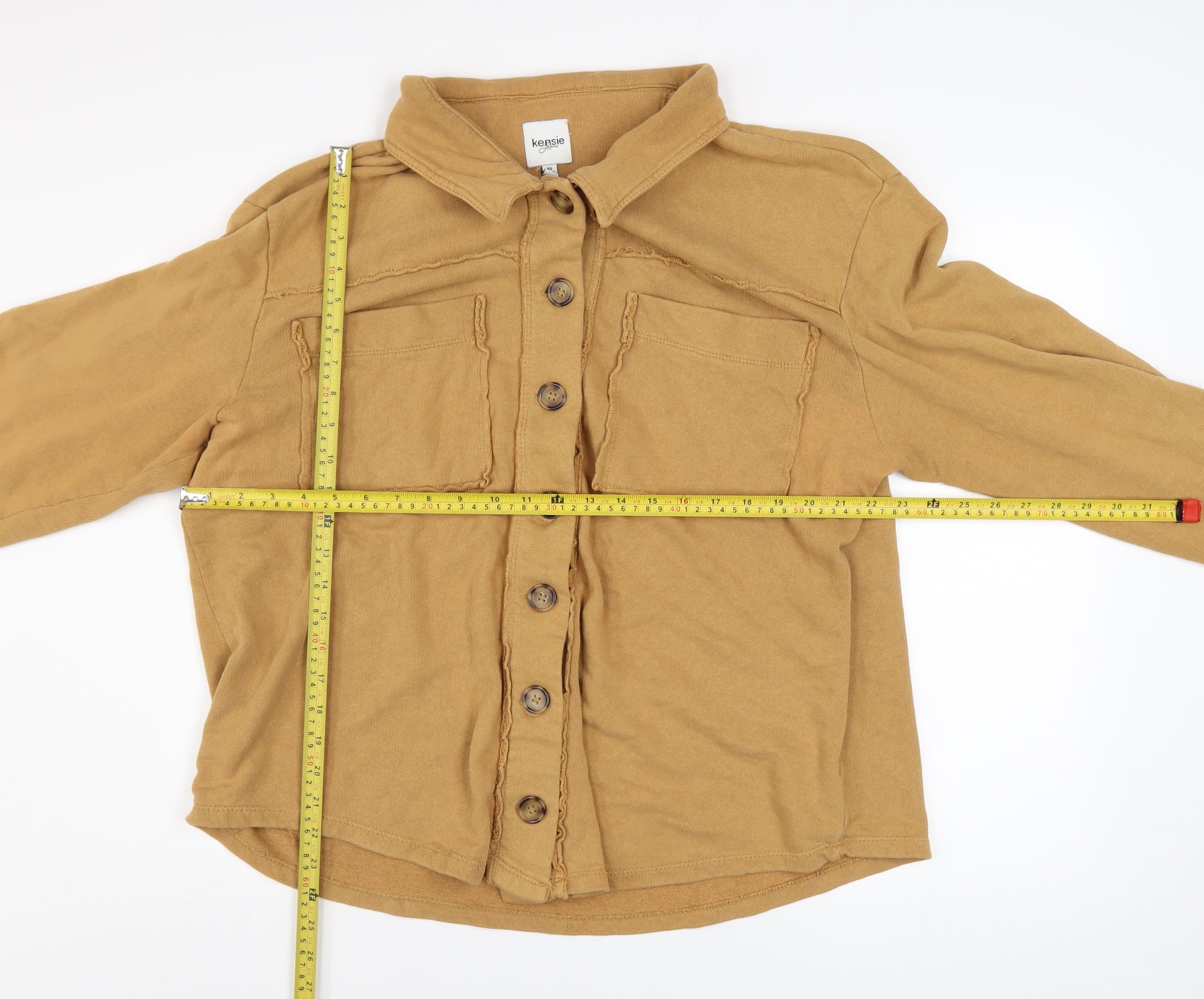 Add relaxed sophistication to your outerwear collection with this women’s brown cotton jacket from Kensie Jeans. Crafted from 100% soft cotton jersey, this versatile piece provides breathable comfort for transitional weather, making it an ideal choice for layering throughout autumn and spring. In a stylish camel-brown tone, it achieves a laid-back yet polished look that complements jeans, skirts, or casual trousers effortlessly. Designed with a collared neckline and button-up front, this jacket delivers a timeless appeal while offering easy wear. The relaxed fit ensures freedom of movement, while the long sleeves add a touch of warmth. Functional front chest pockets enhance both practicality and a casual-chic aesthetic, perfectly balancing utility with style. The garment’s soft cotton fabric ensures comfort throughout the day, with its midweight texture ideal for everyday wear. Featuring subtle stitched seam details and tonal buttons, it’s an understated wardrobe essential with a high-quality finish. The jacket falls to a short length, sitting neatly at the hip, flattering the figure without restricting motion. Its clean, unpatterned look makes it easy to pair with other colours and textures in your wardrobe. Whether layered over a knit top, tee, or blouse, it transitions seamlessly between casual and smart-casual outfits. Perfect for coffee dates, weekend walks, or relaxed office days, this jacket brings effortless chic to everyday dressing. Although pre-loved, it remains in very good condition, showing only a small mark on one sleeve, otherwise well-maintained with no major flaws. Machine washable for easy care, it’s practical yet stylish, lightweight yet sturdy. Ideal for eco-conscious shoppers seeking sustainable second-hand fashion, this Kensie Jeans cotton jacket offers longevity and comfort in one contemporary piece. Style it open over a white top for a relaxed vibe or button it up for a more refined finish – either way, it’s a versatile staple you’ll reach for season after season.