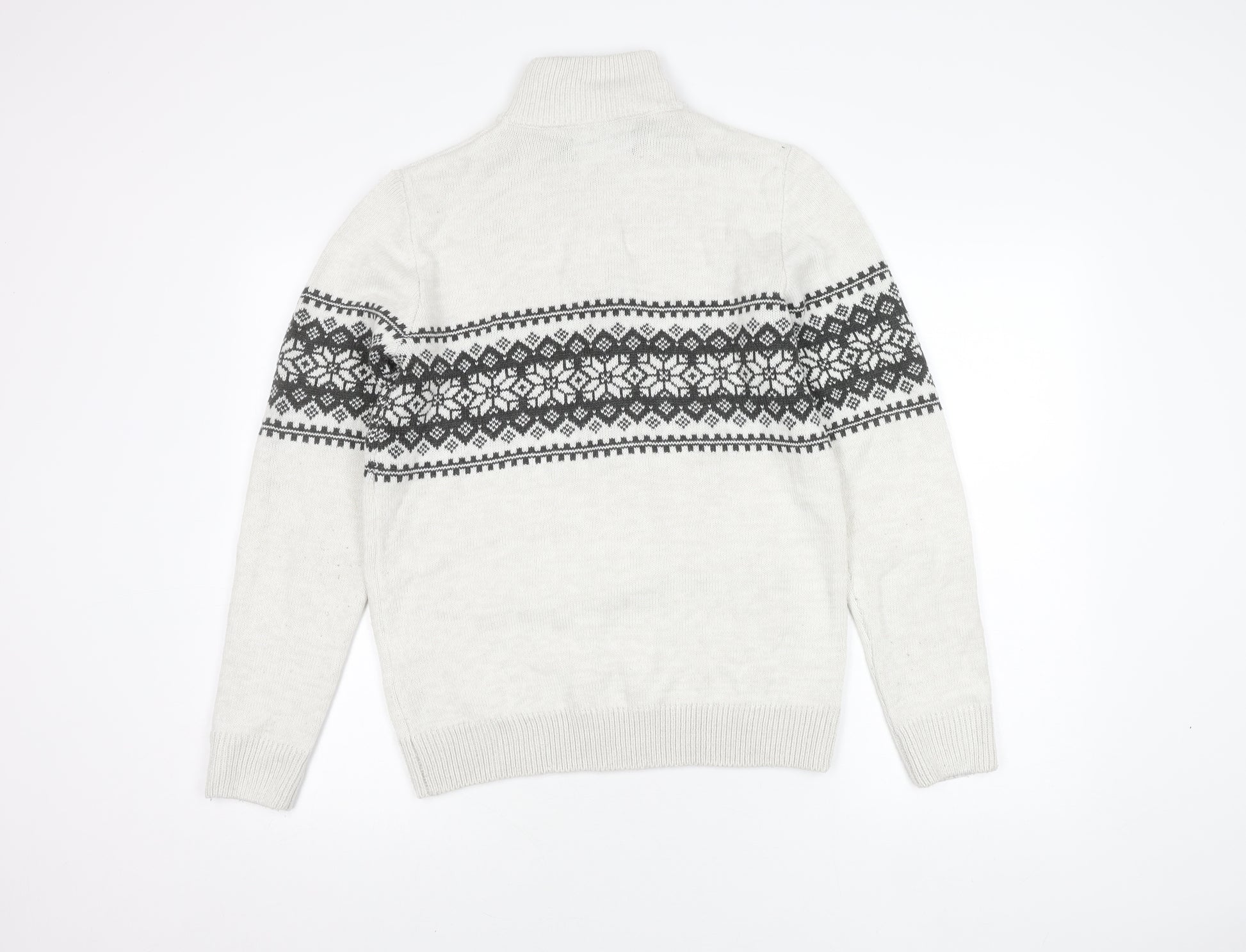 Embrace the chill of winter in style with the Kensington Eastside Men's White Fair Isle Jumper. Designed for the modern man with an eye for classic patterns, this jumper in a crisp white hue is adorned with an intricate Fair Isle pattern across the chest. Crafted from a blend of 80% cotton and 20% polyester, it offers a comfortable and warm experience perfect for those cold winter days.The jumper features a high neck with a convenient 1/2 zip, allowing you to easily adjust it for comfort and style versatility. Designed for regular fit, it ensures a casual yet structured silhouette, making it a versatile addition to your winter wardrobe. Long sleeves keep you warm, while the tight-knit fabric adds durability and warmth without sacrificing breathability.This machine washable jumper is easy to care for, ensuring you can keep it looking pristine with minimal effort. Whether you're heading to a casual gathering or enjoying a brisk walk outdoors, this jumper will keep you stylish and comfortable. Its winter theme makes it a perfect choice for the season, allowing you to layer effortlessly over a basic tee or under a robust winter coat.With no visible damage and in excellent condition, this Kensington Eastside jumper is priced affordably to fit any wardrobe budget. Don't miss out on this piece that combines function and fashion effortlessly. Add this Kensington Eastside Men’s White Fair Isle Jumper to your collection and step out in style this winter.