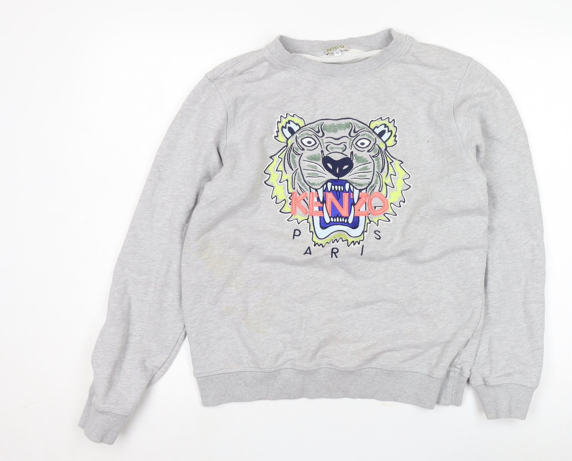 Experience stylish relaxation with this Kenzo Boys Grey Pullover Sweatshirt. Perfect for the young fashion enthusiast, this regular fit sweatshirt combines practicality with flair. Made from a breathable cotton blend, it promises comfort and durability for all seasons. The embroidered tiger graphic on the front adds a bold style statement, making it ideal for casual outings or relaxed weekend wear. Functional as well as trendy, this sweatshirt is machine washable, ensuring easy care. Despite some minor discolouration, it remains in very good condition, ensuring excellent value for money. Ideal for boys aged 16, this classic crew neck jumper is a must-have wardrobe essential, offering both style and versatility.