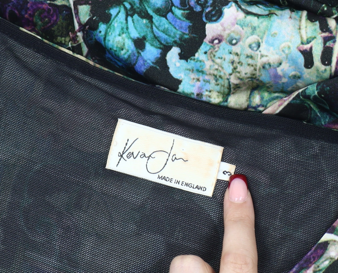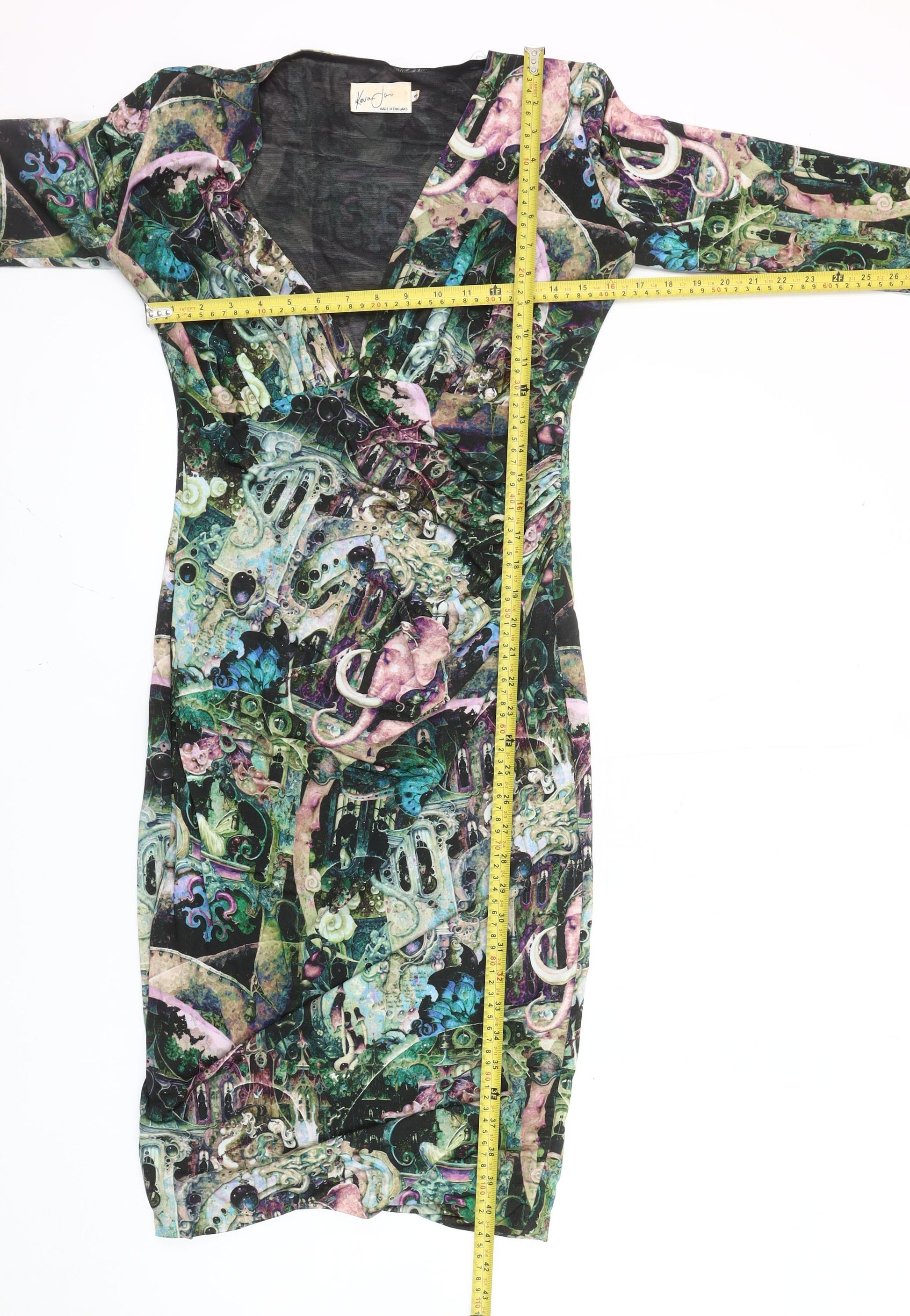 Step out in style with this striking Kevan Jon women's bodycon dress, designed to turn heads with its bold multicoloured artistic print. Expertly crafted in England, this knee-length dress features a figure-hugging silhouette made from a luxurious jersey fabric blend of 94% viscose and 6% elastane, offering both comfort and a flattering fit. The garment’s stretch quality ensures ease of movement while maintaining its sculpted shape. Perfect for a variety of occasions, from parties and cocktail events to elegant evenings out, this dress boasts a deep and enticing V-neckline paired with full-length sleeves for a touch of sophistication. The vibrant, abstract pattern enhances its standout appeal, while the pullover design keeps it effortlessly wearable. Suitable for wear throughout the year – spring, summer, autumn, or even layered in winter – its versatility makes it a must-have in any stylish wardrobe. In excellent pre-owned condition with minimal signs of wear and no visible flaws, this dress offers premium designer quality at a fraction of the new cost. Ideal for the confident woman who loves to make a statement, this Kevan Jon bodycon dress blends artistry and glamour, ensuring you will stand out in any setting. Style with your favourite heels and clutch for a truly show-stopping look that is bound to receive compliments.