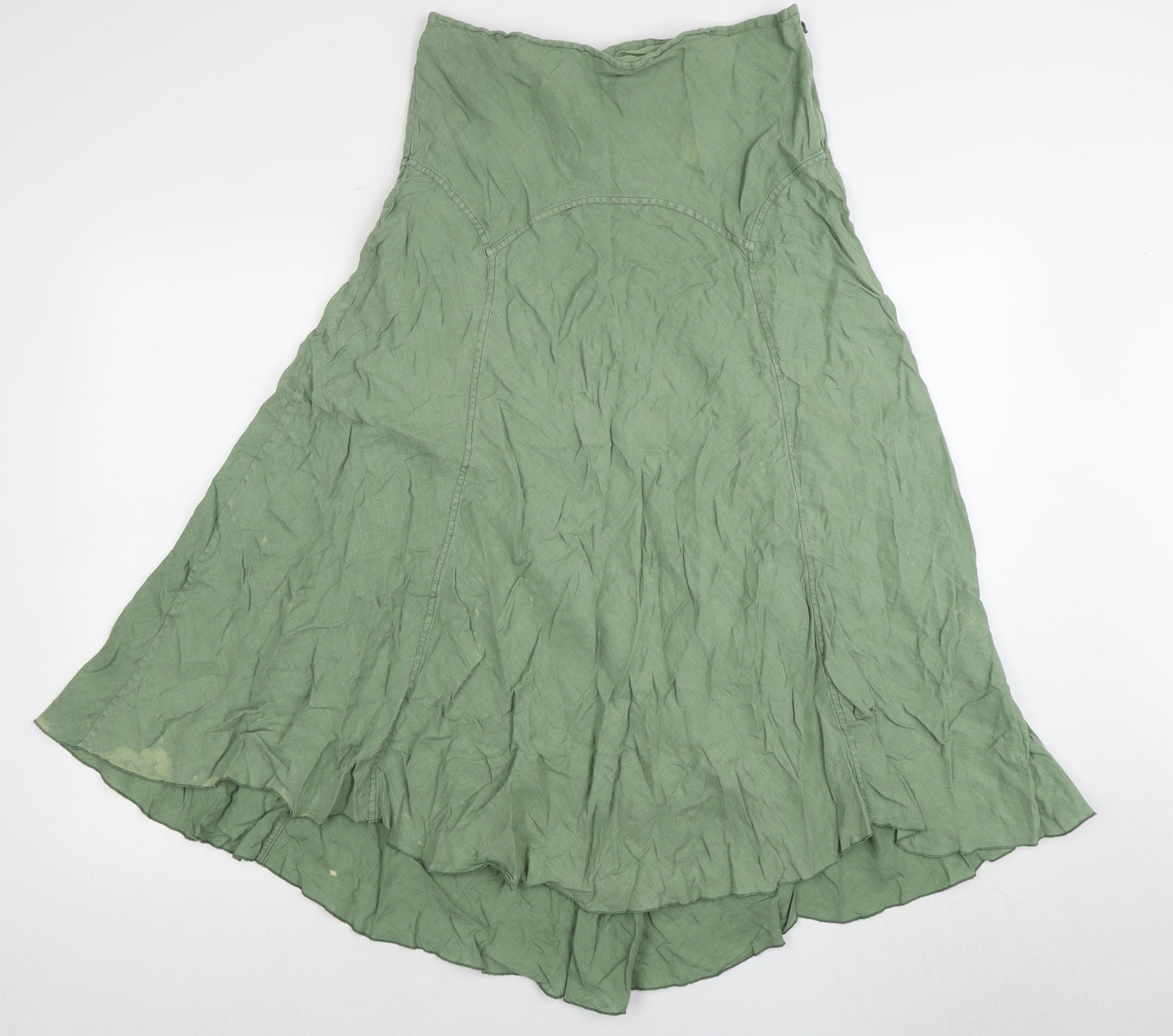 Elevate your wardrobe with this charming Kew A-Line skirt, designed to offer both comfort and elegance in every step. Tailored from high-quality linen, it boasts a fresh green hue perfect for those seeking a touch of nature in their attire. The versatile size 14 ensures a flattering fit for various occasions, whether you're heading to a casual outing or enjoying a laid-back day at the park. This skirt's casual flair is enhanced by its minimalist design, featuring clean lines without any overt patterns. Lined with cotton, it provides an added layer of comfort, making it suitable for all-day wear. Despite its excellent condition, slight wrinkles and minimal discolouration add character, maintaining its timeless appeal. Pair it with a simple blouse and sandals for a chic, effortless look, or dress it up with a tailored jacket and heels for an unexpected twist. Discover the perfect balance between style and practicality with this exquisite linen skirt, a must-have addition to any discerning fashion enthusiast’s collection.
