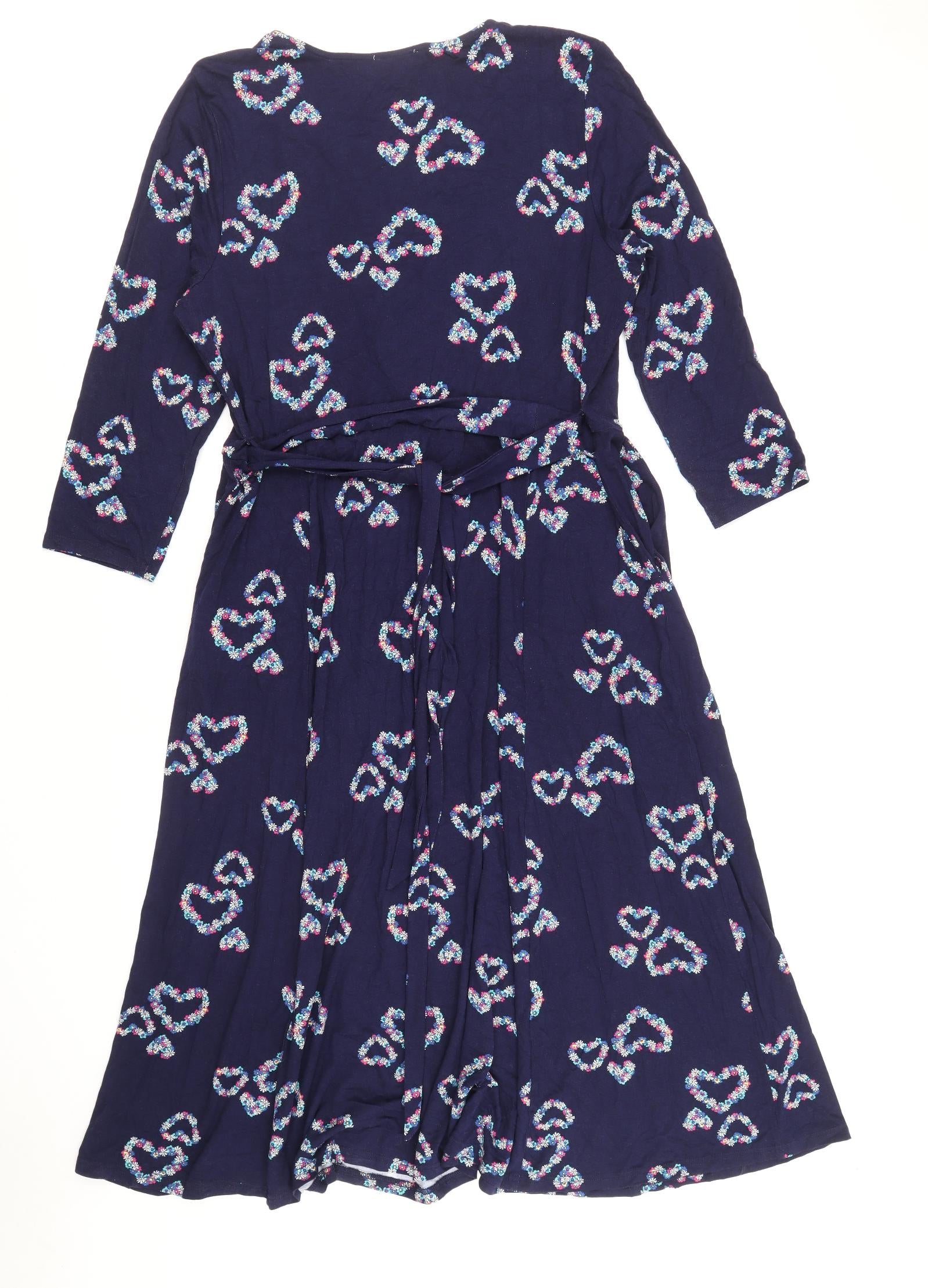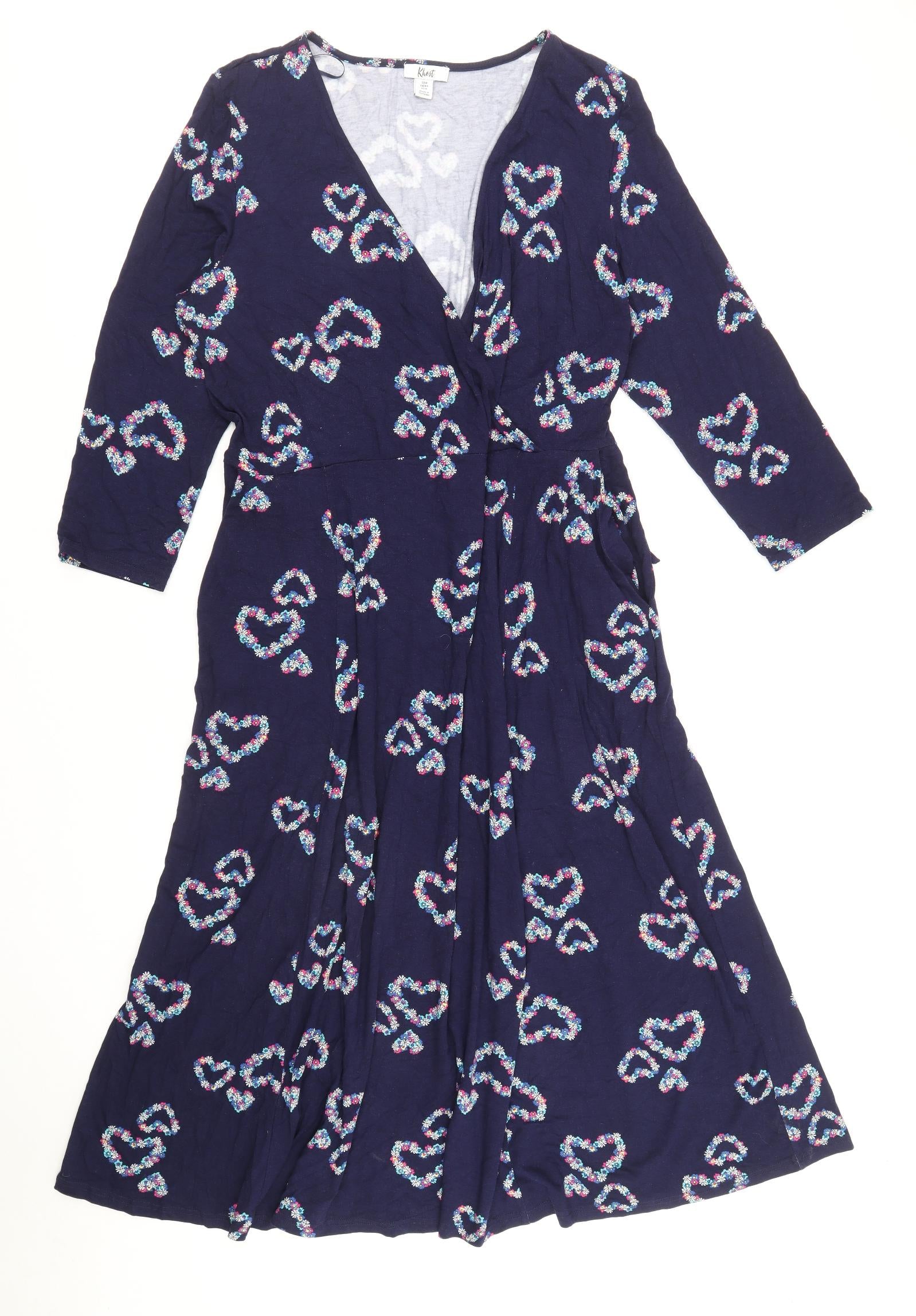 Womens Blue Geometric Viscose Wrap Dress Size 18 V-Neck Pullover - Heart Pattern