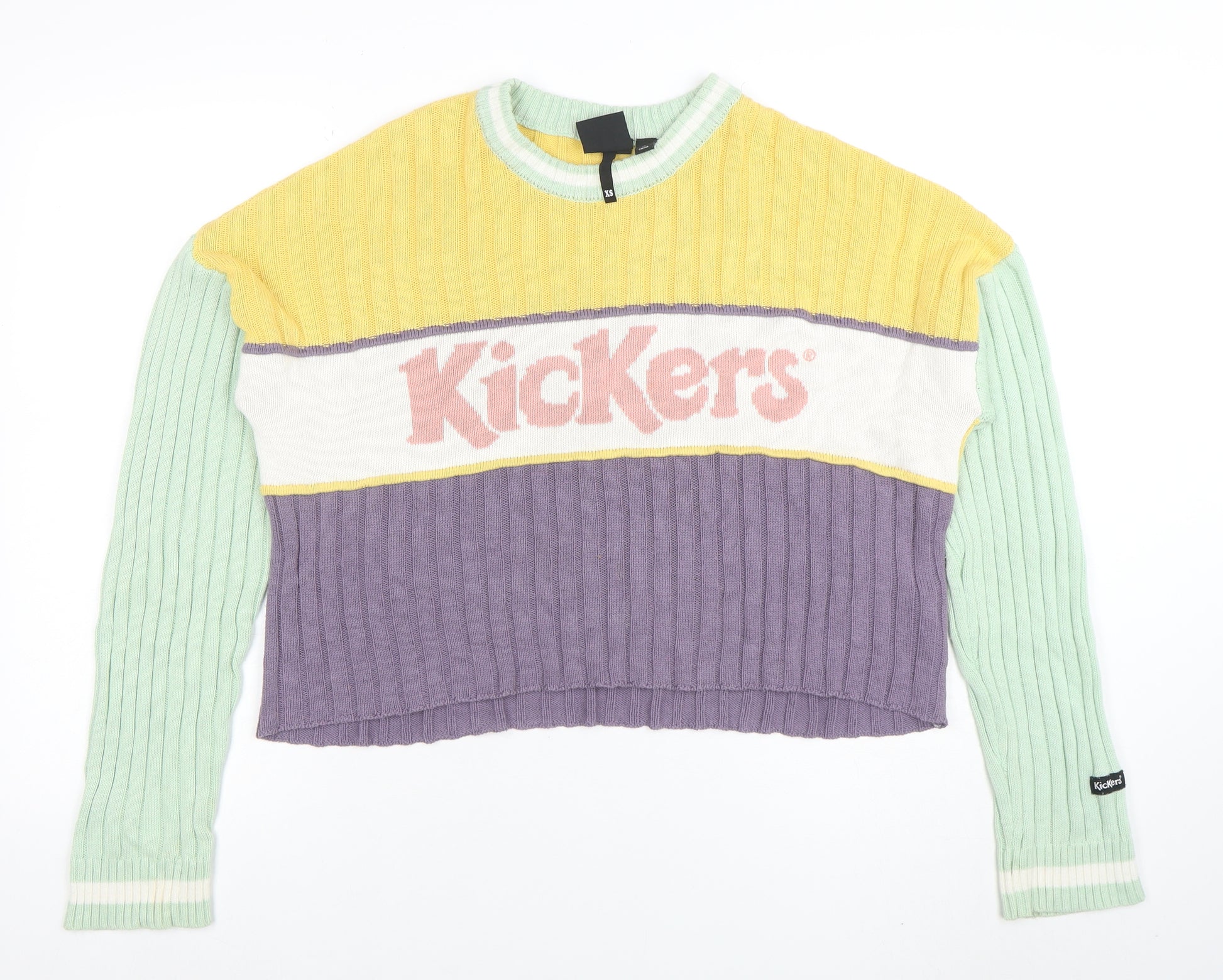 Add a splash of retro charm to your wardrobe with this Kickers Women’s multicoloured ribbed crew neck jumper. Designed with a fun colour block palette in soft pastel tones of yellow, lilac and mint green, it perfectly blends a relaxed sporty aesthetic with cosy knitwear comfort. The bold Kickers logo across the chest gives it a nostalgic branded look that stands out while staying effortlessly casual. Crafted from a soft knit blend of cotton, nylon and elastane, this jumper offers breathable warmth, a hint of stretch for ease of movement, and a smooth texture ideal for layering across the seasons. The ribbed fabric structure enhances the fit, giving it a snug yet flexible silhouette that flatters without clinging. Its long sleeves and crew neckline make it suitable for everyday wear, whether paired with jeans for a laid-back weekend vibe or layered over a crisp shirt for an urban statement. Lightweight and comfortable, this jumper works beautifully from autumn through to cooler spring days. The pastel colour blocking adds a vintage-inspired touch, while the Kickers logo front adds an edge of authenticity and youthful energy. While in very good pre-loved condition, there’s a faint mark on one sleeve that doesn’t detract from the overall appeal. Perfect for fans of nostalgic streetwear and lovers of cosy, colourful style, this Kickers jumper effortlessly combines comfort, individuality and quality craftsmanship in one standout piece. A versatile addition to any casual wardrobe, promising both warmth and personality for any occasion.