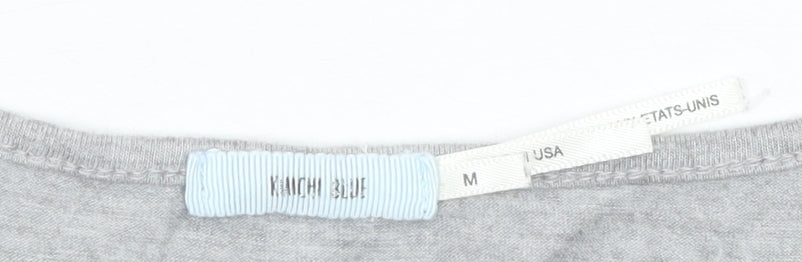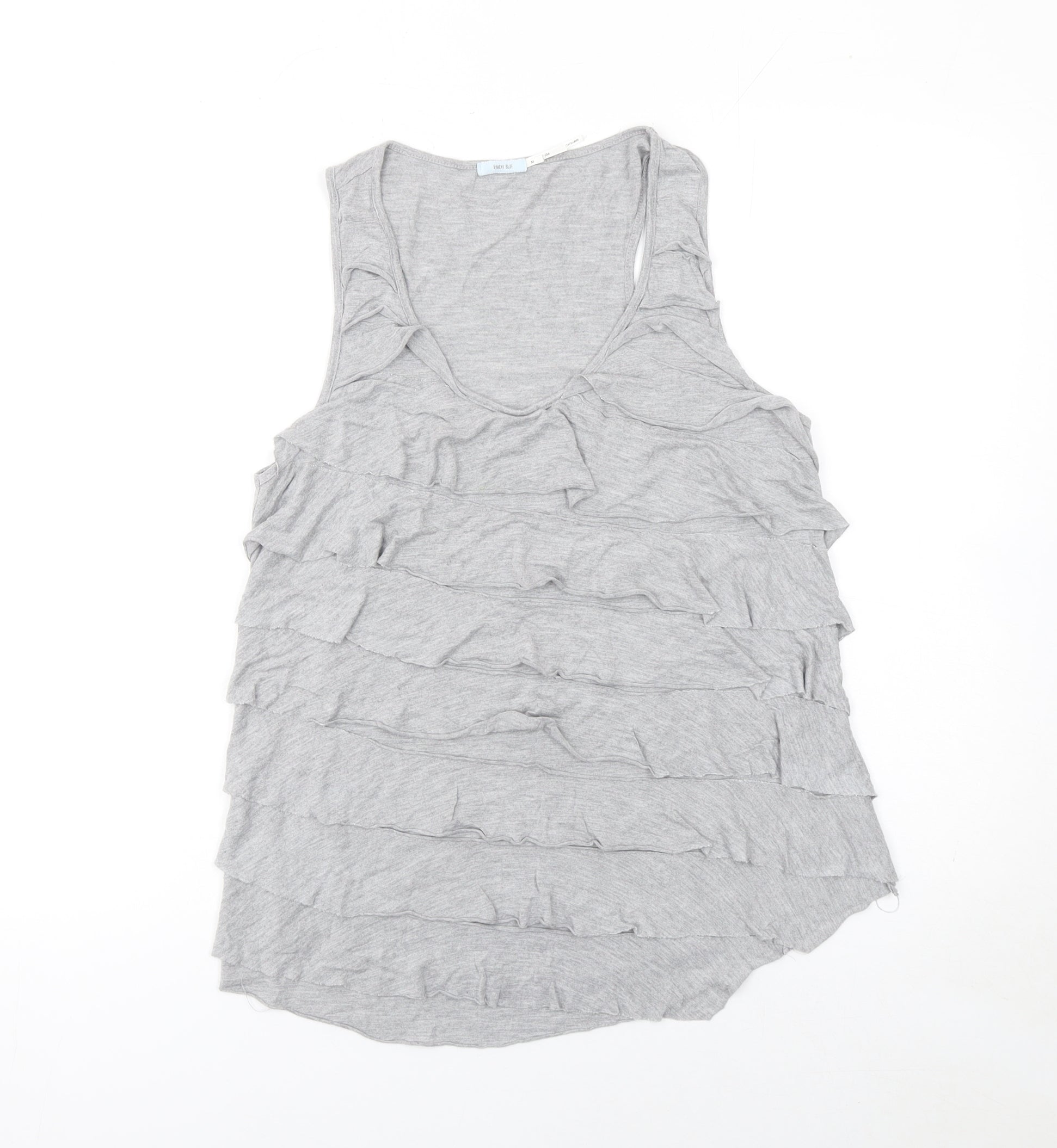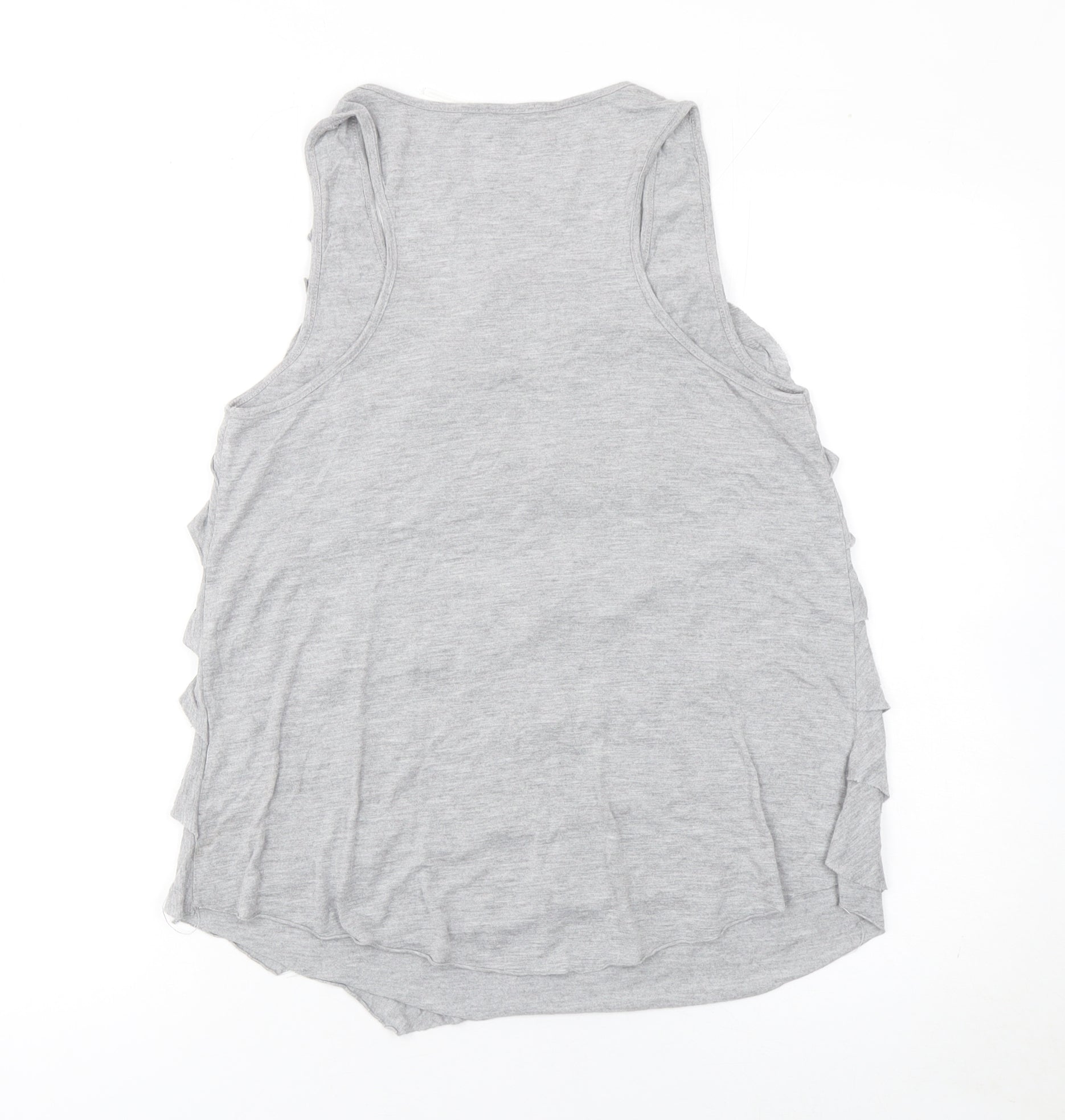 Add a playful and effortlessly stylish touch to your wardrobe with this lovely grey camisole tank top by Kimchi Blue. Designed for women who appreciate comfortable yet chic fashion, this sleeveless top is crafted from soft 100% rayon jersey fabric, which offers a lightweight and breathable feel against the skin. Perfect for casual days out, sunny weekends, or layering under a blazer or cardigan, it combines versatility with modern femininity. The top features a scoop neckline that flatters the shoulders and neckline beautifully. Its standout detail lies in the delicate ruffle accents cascading down the front, adding both texture and movement to the soft grey silhouette. The easy pullover closure and regular fit provide comfort and ease of wear, making it ideal for warm summer days or casual meet-ups. Designed with quality craftsmanship, this timeless piece can be dressed up or down effortlessly. Pair it with denim shorts for a laid-back look, or tuck it into tailored trousers for a casual office ensemble. In excellent pre-owned condition with only light wear, it shows no visible marks or damage. The neutral grey tone makes it an easy match with various outfits and accessories, ensuring it becomes a versatile staple in your wardrobe. Ideal for women who love simple elegance, lightweight fabrics, and stylish subtlety, this Kimchi Blue camisole tank top offers the perfect balance of comfort and design. Refresh your casualwear collection with this must-have top that embodies relaxed charm and everyday sophistication in one effortlessly chic piece.