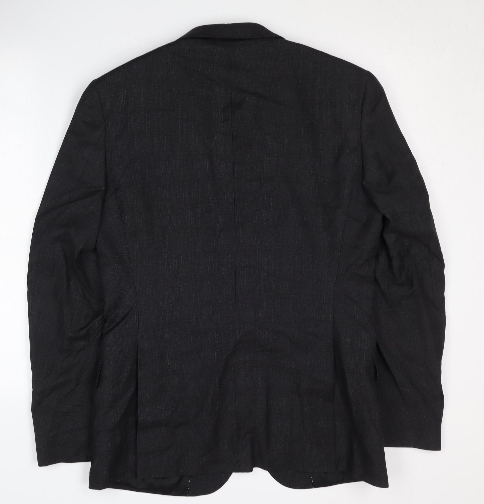 Embrace timeless elegance with the Kin by John Lewis Men's Black Slim Fit Blazer, a perfect addition to your formal wardrobe. Designed in a sophisticated style, this black single-breasted blazer features a classic notch lapel, adding a refined touch to any outfit. Crafted from a high-quality blend of 50% polyester and 50% wool, it offers both durability and comfort, making it ideal for the cooler autumn and winter seasons. The meticulously tailored slim fit provides a modern silhouette, ensuring you look sharp and fashionable. This blazer is tailored for men and features a regular coat length, along with a double-vented back for enhanced mobility. With its two-button front and four-button sleeves, it exudes a polished and professional look. The lining, crafted from 52% polyester and 48% viscose, adds an extra layer of comfort, while its formal design makes it an excellent choice for business meetings, weddings, and special occasions. Please note that this garment is dry clean only to maintain its premium quality. Although pre-owned, it remains in excellent condition with no visible defects. Elevate your style and make a statement wherever you go with this versatile and classic blazer.