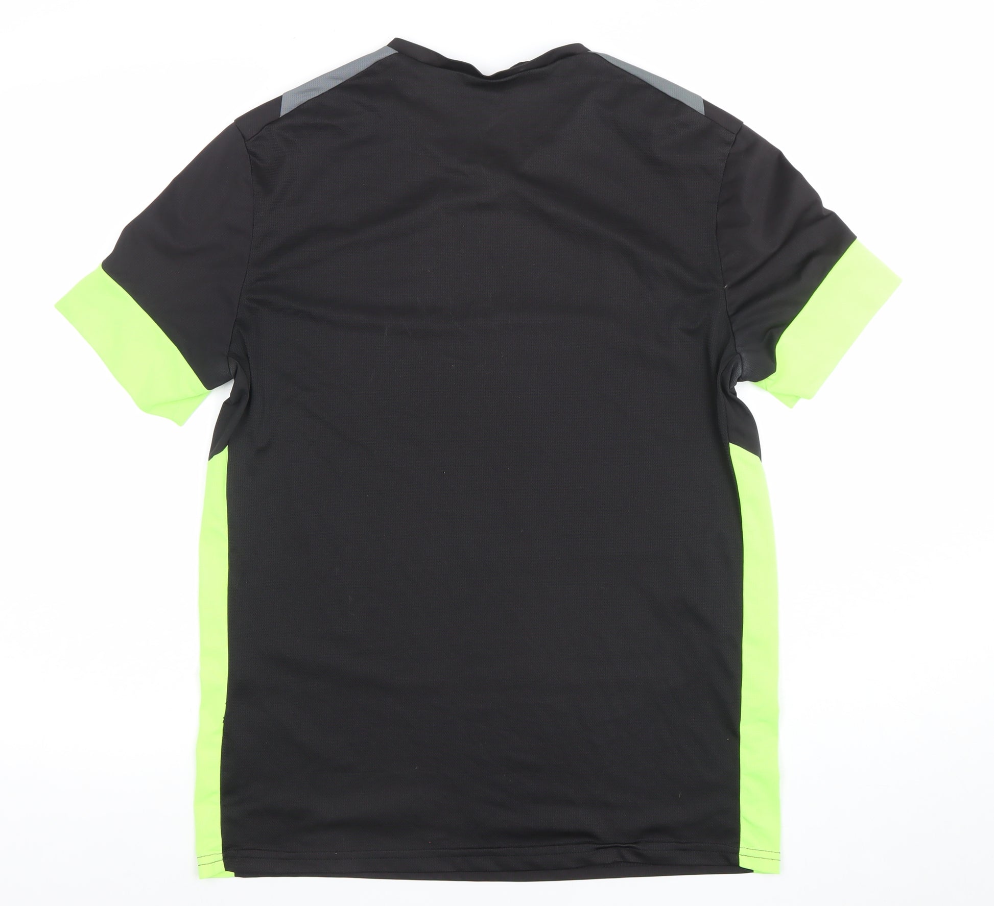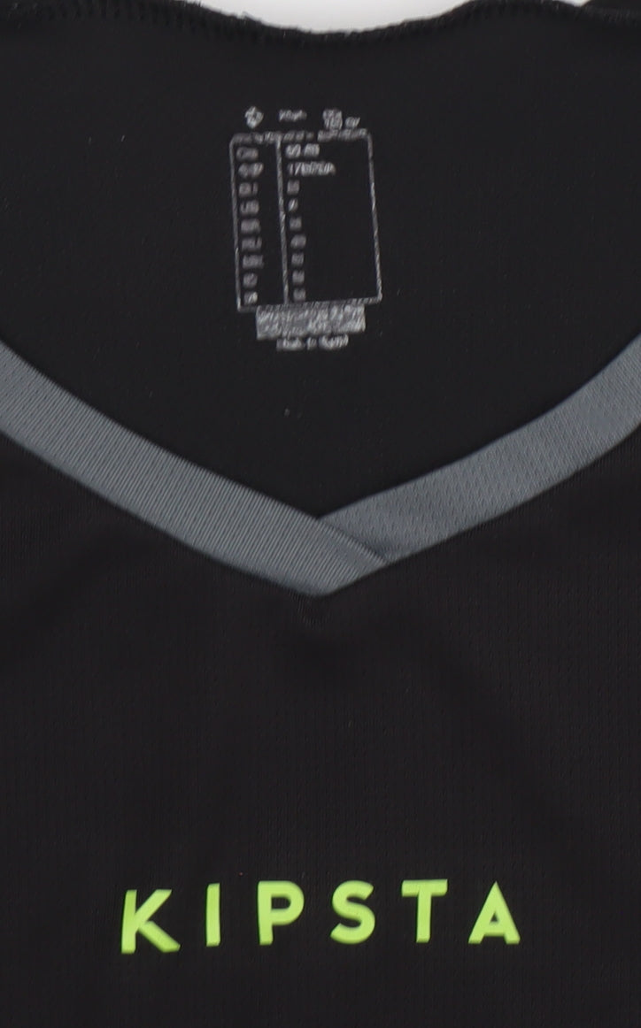 Stay cool and comfortable during your training sessions with this Kipsta Men's Black Short Sleeve V-Neck Football T-Shirt in size Small. Designed for performance, this lightweight and breathable top is crafted from 100% polyester with a moisture-wicking and quick-dry finish, helping to keep you dry and fresh throughout your workout or match. The shirt features a stylish athletic cut with contrasting neon green and grey colour block detailing on the sleeves and shoulders, offering a modern, sporty look that’s perfect both on and off the pitch. The V-neckline enhances comfort and ease of movement, while the raglan sleeve design ensures a full range of motion during any activity. Ideal for football, gym training, or running and jogging, this versatile piece of activewear transitions easily from practice sessions to casual sportswear. The Kipsta logo printed on the chest adds a finishing touch that reflects its sporting heritage and quality. The top is machine washable for easy care and offers durability that withstands regular use, maintaining its shape and colour after multiple washes. Perfect for active men who value comfort, style, and practicality, this Kipsta t-shirt is a great addition to any sports wardrobe. Whether you’re hitting the gym, joining a weekend football match, or going for a jog, this t-shirt delivers performance, comfort and sleek athletic style. In excellent used condition with only minimal signs of previous wear, it represents superb value for performance-focused sportswear enthusiasts looking for reliable, functional kit.