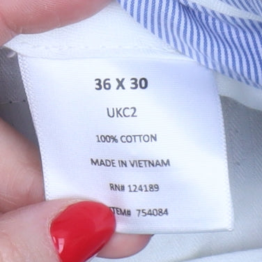 Introducing the versatile Kirkland Signature Men's Chino Trousers in a timeless beige hue, perfect for a range of occasions from casual outings to semi-formal gatherings. Designed with a regular fit, these chinos offer both style and comfort, ensuring you look sharp without compromising on ease of movement. Crafted from 100% cotton, the fabric provides breathability, making these trousers an ideal choice for spring, summer, and even autumn wear.The flat front and straight leg style give a clean, contemporary look that can be effortlessly paired with a dress shirt for a smart appearance, or dressed down with a t-shirt or polo for casual settings. Featuring a mid-rise, these trousers provide a comfortable fit around the waist, while the button closure adds a classic touch. Practicality is not forgotten, as these chinos come with multiple pockets, including slash pockets for handy storage of everyday essentials.Machine washable for easy care, these trousers are not only stylish but also low-maintenance, fitting seamlessly into your daily wardrobe routine. Despite being pre-owned in excellent condition, these chinos exhibit no visible wear apart from being slightly wrinkled, assuring you of their durability and quality.Elevate your style with these Kirkland Signature Chino Trousers that blend fashion with function. Whether you're heading to work, attending a casual event, or enjoying a weekend stroll, these trousers are your go-to choice for a sleek and polished look. Update your wardrobe today with a staple piece that promises versatility and timeless appeal.