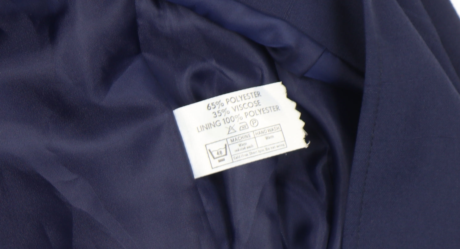 Elevate your professional wardrobe with this refined navy blue suit jacket from Klass Collection. Cut in a flattering regular fit, this elegant piece is designed specifically for women who appreciate timeless sophistication and versatile style. Crafted from a durable woven blend of 65% polyester and 35% viscose, it offers both comfort and structure for a polished silhouette that transitions effortlessly from office to occasion. The jacket features long sleeves, subtle tailoring through the body, and a smooth 100% polyester lining for added comfort. With its sleek round neckline and open front with no visible buttons, it delivers a modern take on classic suiting. Perfect for pairing with tailored trousers or a matching skirt, this jacket is suitable for business meetings, formal events, and workwear settings throughout spring, autumn, and winter. The dark navy blue colour provides a professional yet refined appeal, making it easy to incorporate into a variety of outfit combinations. Designed for day-long comfort, it remains breathable, machine washable, and low-maintenance, retaining shape and finish even with frequent wear. The lack of lapel and minimalist front give it a clean, contemporary aesthetic ideal for layered styling over blouses or tops. Whether worn as part of a complete suit or on its own, this jacket captures the essence of effortless elegance. With very light wear and no visible damage, it is in excellent pre-owned condition and ready to deliver many more seasons of style and reliability. A wardrobe essential for the modern professional, this Klass Collection navy jacket offers timeless quality and refined simplicity at a great value.