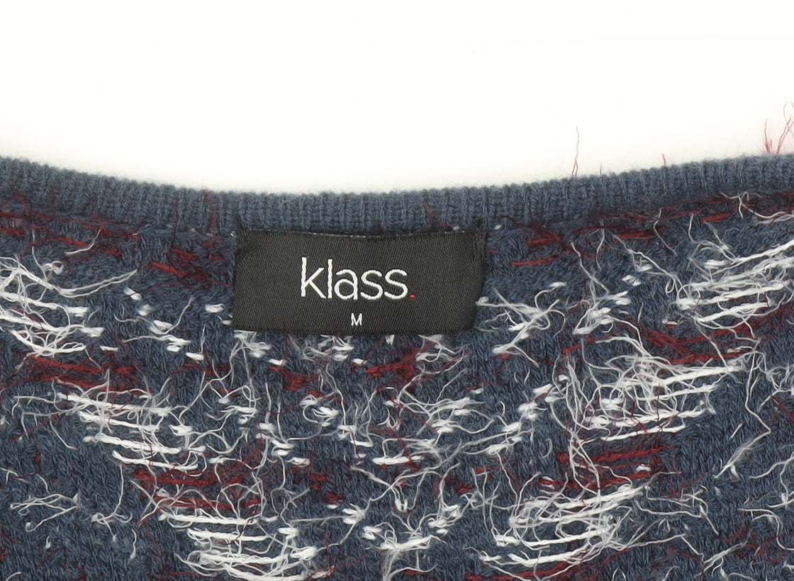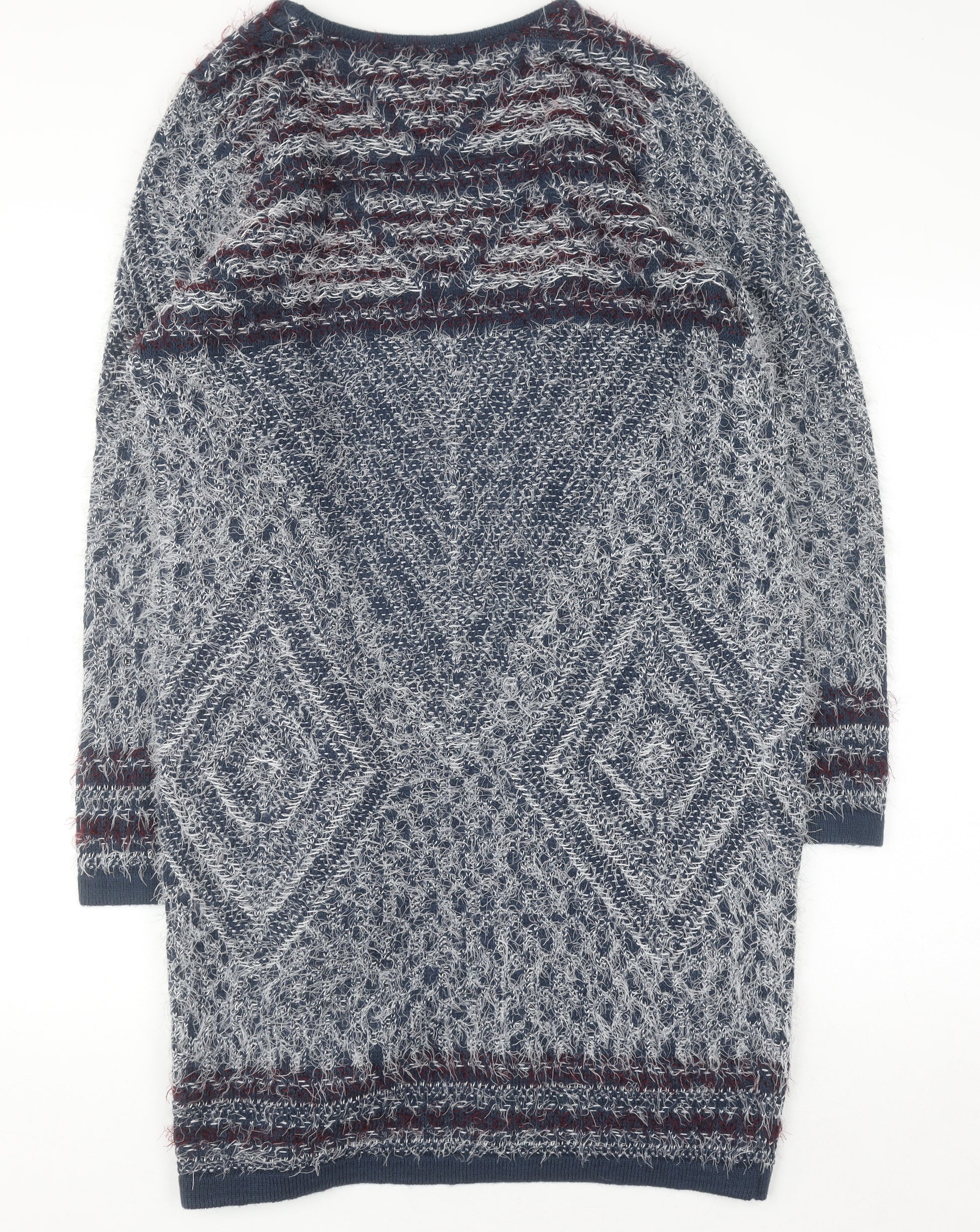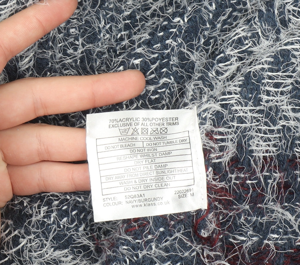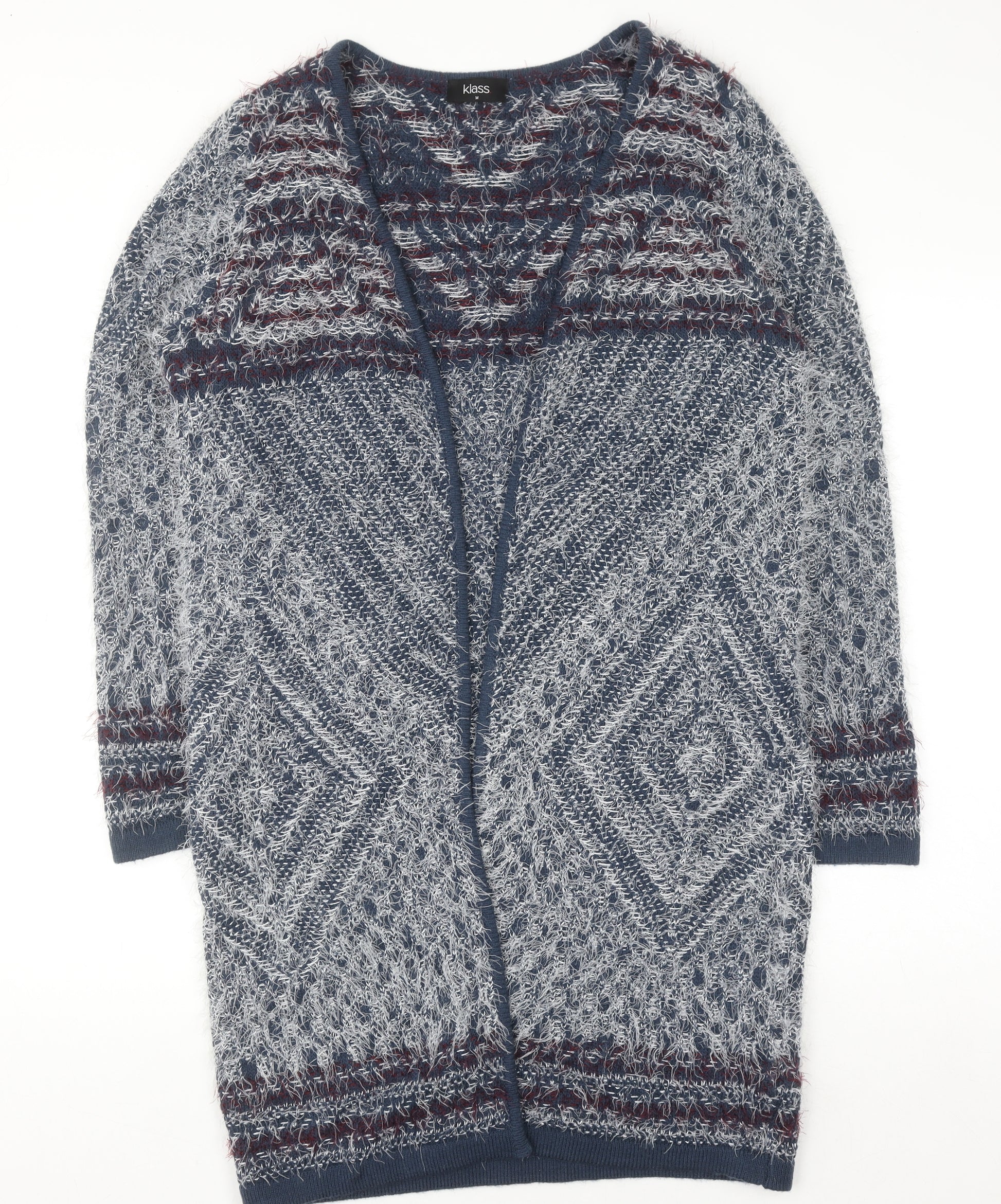 Add a touch of sophisticated comfort to your wardrobe with this Klass women’s open-knit cardigan. Beautifully crafted in a geometric pattern that features navy, burgundy, and grey tones, this relaxed fit piece provides the perfect balance of elegance and warmth. The medium size offers a flattering and comfortable silhouette, ideal for layering over tops or dresses during the cooler autumn and winter seasons. Made from a soft blend of 70% acrylic and 30% polyester, it ensures a cosy texture while maintaining lightweight breathability. The long sleeves and open front design create a versatile layering piece that transitions easily from casual days to smart-casual outings. The intricate knit style adds depth and texture to your outfit, while its geometric pattern gives it a timeless, classic look. Perfect for pairing with jeans, trousers, or a skirt, this cardigan makes an effortless addition to any woman's wardrobe. Its relaxed fit and comfortable knit make it ideal for everyday wear, travel, or even cosy evenings at home. This pre-owned piece is in excellent condition with minimal signs of previous wear and has been carefully checked to ensure quality. Easy to care for, this jumper can be machine washed on a cool cycle to keep it looking fresh. A wonderful choice for anyone seeking comfort with a touch of refined style. Elevate your seasonal looks with this Klass cardigan that effortlessly blends design and wearability, perfect for layering styles throughout the year. Secure this beautiful, classic cardigan today and enjoy its enduring appeal in your wardrobe.