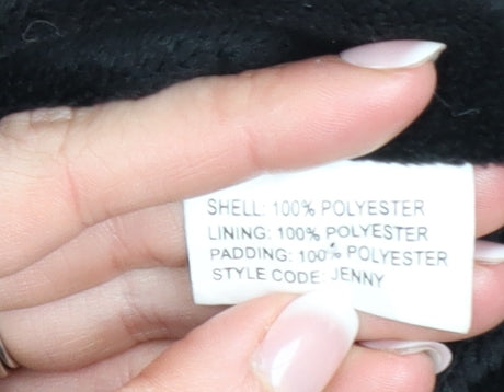 Upgrade your cold-weather wardrobe with this elegant black jacket from Klassik Clothing, designed specially for women seeking a timeless outerwear piece that combines functionality with smart design. Crafted from durable polyester, this mid-length jacket provides lightweight comfort and dependable wear, perfect for chillier days in autumn and winter. With a fully lined interior, it delivers added warmth without bulk, making it versatile from day to night. The jacket features sleek silver-toned metal eyelet accents at the waist and cuffs, giving a modern, structured edge to a classic silhouette. Designed in a flattering regular fit, it’s cut to sit comfortably while allowing room for layering over jumpers or blouses. The practical zip closure ensures ease of use, and the subtle detailing adds a touch of sophistication. Its black colour ensures it pairs effortlessly with any outfit—from office attire to smart-casual weekend looks. Ideal for travel or day-to-day wear, this jacket blends elegance with comfort and durability. The 100% polyester shell, lining, and padding ensure easy care, as the jacket is machine washable—a perfect choice for those seeking low-maintenance fashion that still looks refined. This garment remains in very good pre-loved condition, with only minor marks near the cuff area, retaining its polished appearance and structure. Whether worn as part of your commute outfit, a casual errand-day ensemble, or a lightweight cover-up on colder evenings, this Klassik Clothing black jacket offers sophisticated simplicity for modern wardrobes. A stylish essential that will remain an enduring favourite season after season.