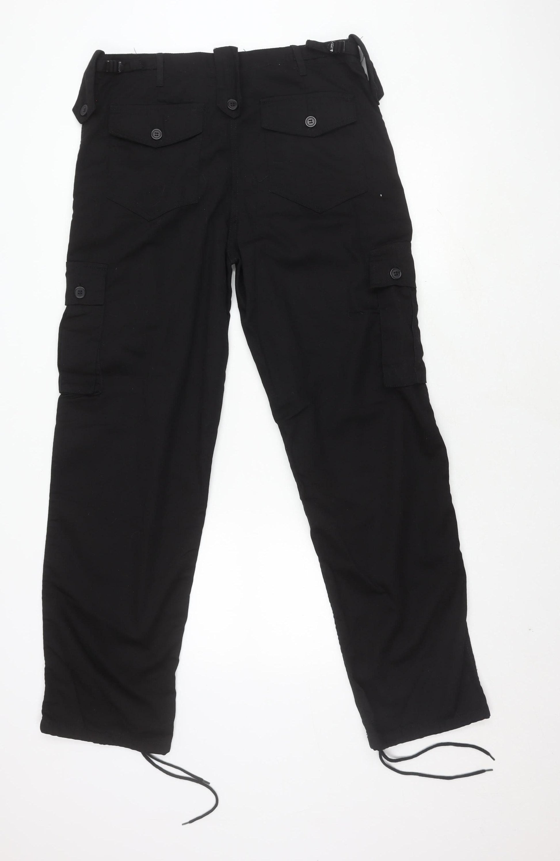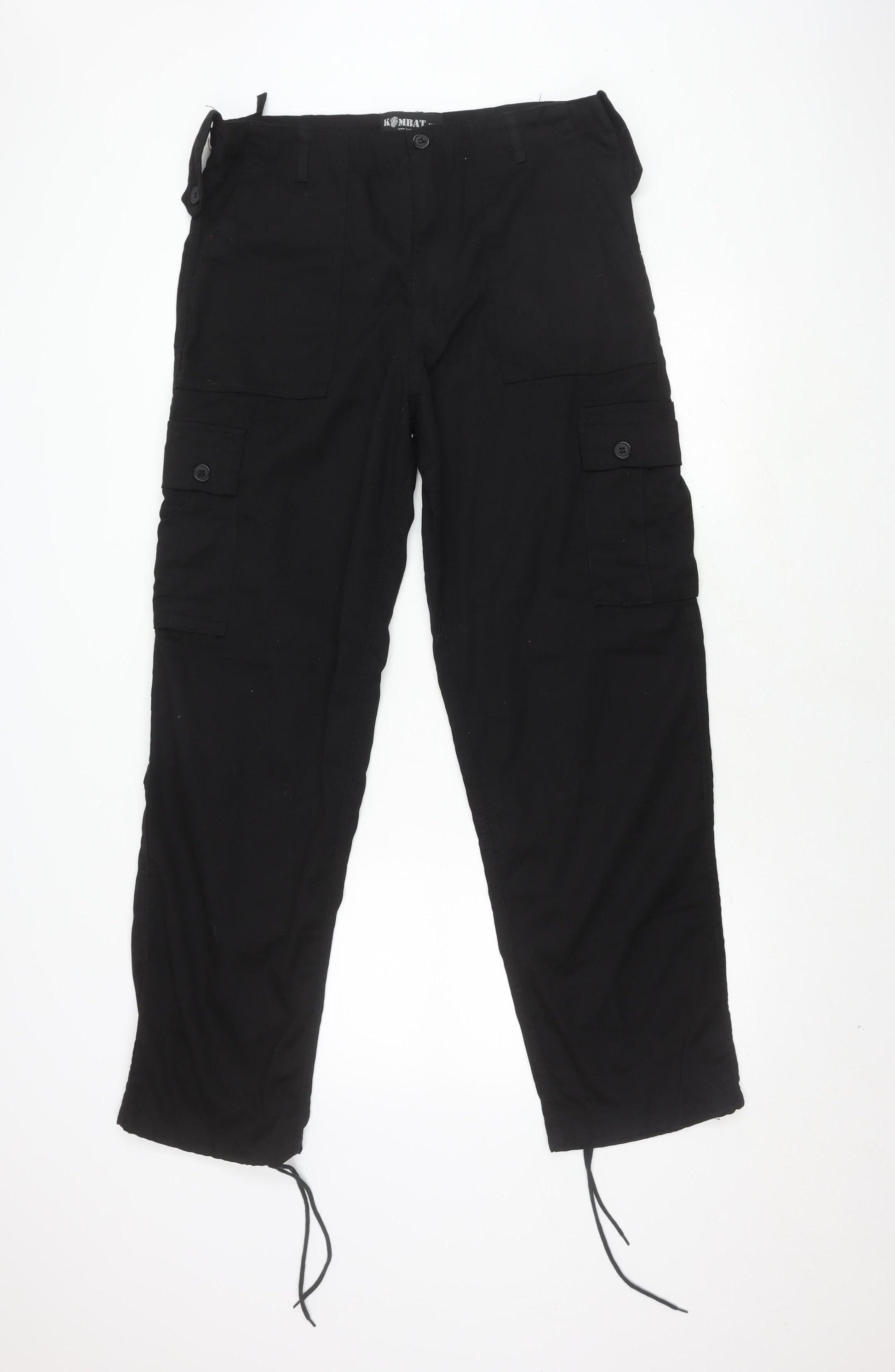 Upgrade your wardrobe with the KOMBAT UK Men's Black Cargo Trousers, designed for both casual outings and workwear. These trousers come in a sleek black hue, perfect for any occasion. Crafted from a durable canvas fabric with a composition of 65% polyester and 35% cotton, they ensure comfort and longevity. The regular fit and straight leg style provide a classic silhouette that remains stylish. With functional cargo pockets, these trousers offer ample storage for your essentials. The trousers feature a convenient button and zip closure and flat front design, enhancing their practicality. Ideal for year-round use, they are machine washable for easy care. These trousers are in excellent condition, showing no visible signs of wear, making them an excellent choice for those seeking quality and style at a reasonable price. Don't miss out on adding these versatile cargo trousers to your collection.