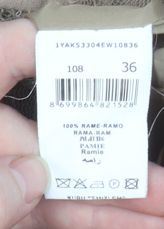 Elevate your wardrobe with this sophisticated beige blazer from Koton, crafted with care from 100% ramie. Known for its breathable and natural woven texture, this beautiful piece makes the perfect addition to your smart-casual or workplace collection. Designed in a flattering regular fit, the blazer features a single-breasted cut with a one-button front closure, ensuring a timeless silhouette that complements both tailored trousers and skirts. The notched lapel design and subtle structure of this piece convey understated elegance while its lightweight, lined construction ensures comfort and ease of movement throughout the day. Ideal for transitional seasons, this versatile blazer pairs beautifully with linen trousers or jeans for a chic business-casual look. Its natural beige tone lends itself easily to layering, allowing effortless mixing and matching across your wardrobe. Whether you’re dressing for the office, a formal meeting, or an evening out, this jacket’s refined tailoring and minimalist aesthetic make it a go-to staple.The inner lining provides a smooth fit, while the practical front pockets add subtle utility. The fabric composition of pure ramie ensures breathability, durability, and a softly textural finish, mimicking the luxurious feel of linen. Designed for spring, summer, and autumn wear, this piece blends professional polish with everyday comfort—perfect for women who value quality and versatility in their clothing. In excellent pre-owned condition with only mild signs of wear and light creasing, this Koton blazer retains its appeal and shape. Perfectly priced for style-conscious shoppers seeking quality tailoring at great value, it offers a timeless investment piece you’ll turn to season after season. Pair it with neutral tones or bold accessories for a modern finish that suits every occasion.