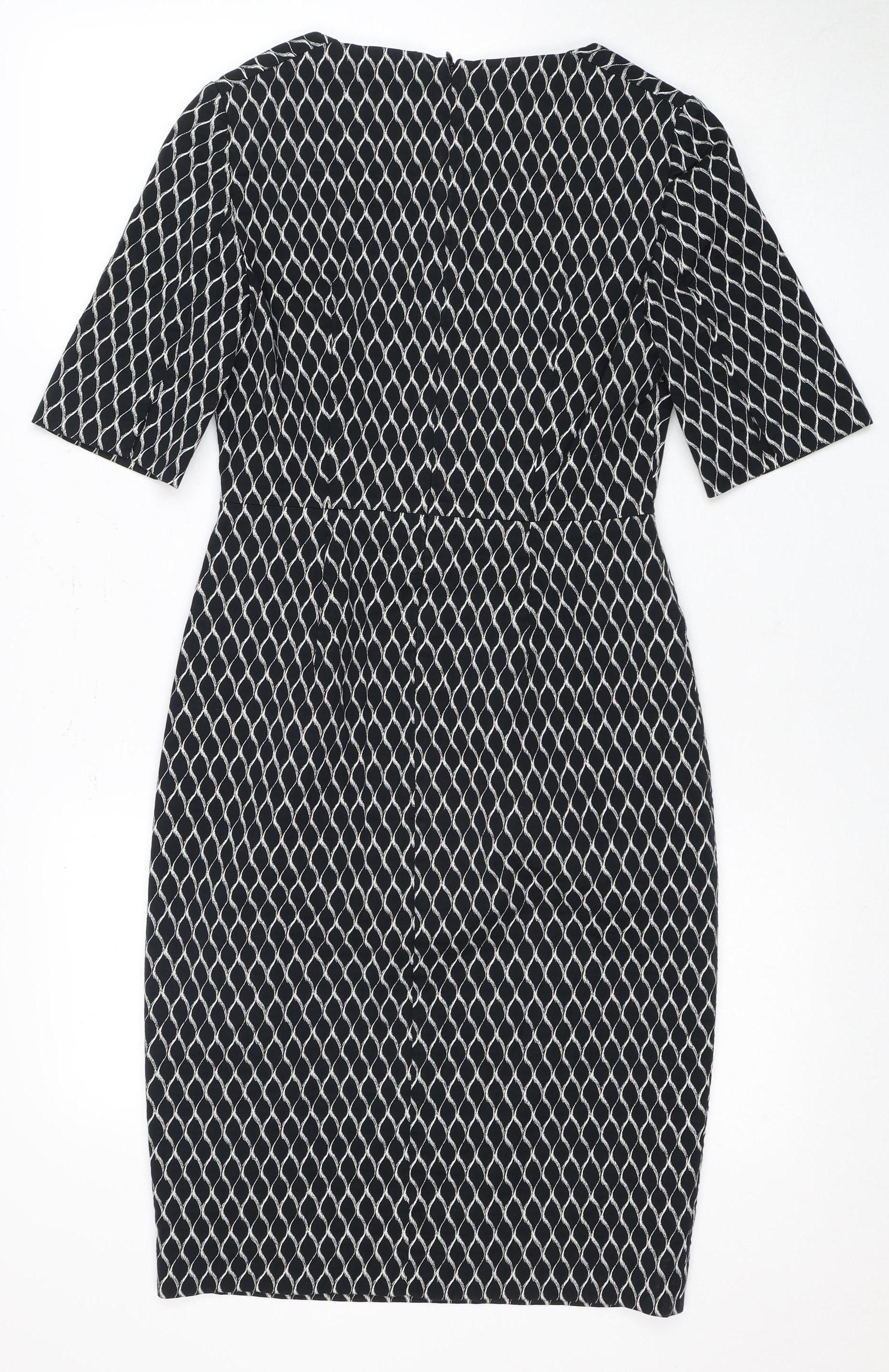Elevate your wardrobe with this L.K. Bennett Women’s Pencil Dress, designed for those who love to blend style and sophistication. Crafted from a luxurious woven fabric with a 97% Cotton and 3% Elastane composition, this knee-length dress ensures both comfort and stretch, making it ideal for workwear or formal occasions. The black geometric pattern adds a classic yet modern touch, perfect for autumn and winter seasons. The dress features a square neckline and is fastened with a zip closure for ease of wear. Its short sleeves make it versatile for layering or wearing solo. This regular size 8 dress is machine washable, offering convenience without compromising on style. Despite being pre-loved, the dress is in excellent condition with no visible flaws. A perfect addition to any wardrobe that values elegance and timeless style.
