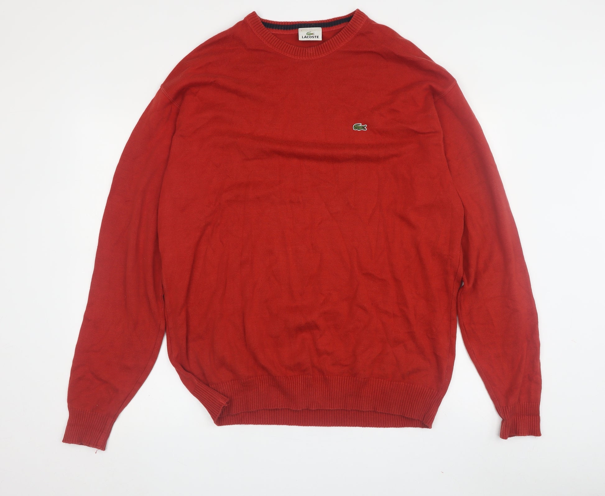Embrace casual elegance with this classic Lacoste Men's Pullover Jumper in a vibrant red hue. Crafted from 100% premium cotton, this jumper offers superior comfort and durability, perfect for all seasons. Its crew neck design and regular fit make it a versatile addition to your wardrobe, suitable for any casual occasion. The iconic Lacoste logo embellishes the front, adding a touch of sophistication and brand recognition. Ideal for layering or wearing solo, its knitted fabric ensures style and warmth throughout the day. The jumper's long sleeves make it perfect for cooler weather, while the breathable material keeps you comfortable during warmer days. A must-have staple for any fashion-forward man's collection, offering style and practicality. Available in size 3XL to accommodate a regular fit for various body types. Despite a slight wrinkle in the fabric, this garment maintains an excellent condition, ready to elevate your everyday look.