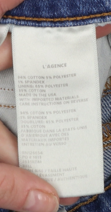 Step out in timeless style with these elegant L'AGENCE women's blue flared jeans, designed to deliver a flattering and elongating silhouette. Crafted from a soft yet durable denim blend of 94% cotton, 5% polyester and 1% elastane, these jeans offer just the right balance of structure and stretch for a comfortable, sculpted fit. The high rise provides a smooth waistline, while the flared leg adds a contemporary twist reminiscent of classic retro fashion. Made with care in the USA using imported materials, these jeans exemplify quality craftsmanship and attention to detail.Featuring a traditional five-pocket design and secured with a zip and button closure, these jeans are as practical as they are stylish. Their medium wash blue finish is endlessly versatile, perfect for pairing with crisp shirts, soft knits, or a flowing blouse for an effortless look. Slight stretch ensures ease of movement, making them perfect for everyday wear. The clean, unfussy styling and subtle fading enhance their denim charm, while the raw hem adds a modern edge.Ideal for spring through autumn, these flared jeans can be effortlessly dressed up with heeled boots or down with trainers for weekend outings. In excellent pre-loved condition with only light, expected wear from minimal use, they present a fantastic opportunity to add premium denim to your wardrobe at an exceptional value. A beautiful combination of comfort, quality and versatile design, these L'AGENCE jeans capture contemporary fashion's best attributes—feminine, sleek and easy to style. Perfect for women who appreciate premium denim with everyday wearability and timeless appeal.