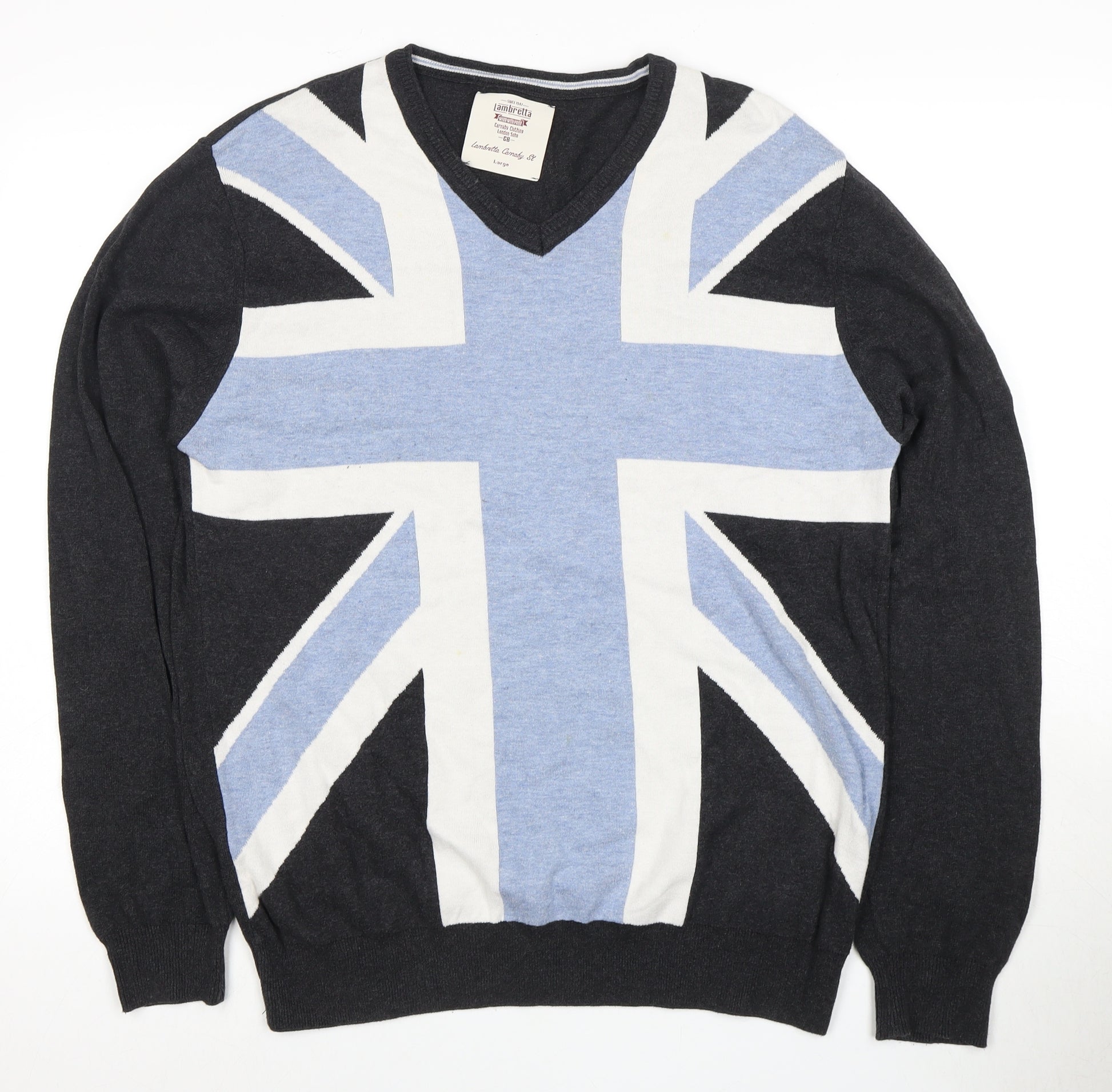Step out in style with this Lambretta Men's Pullover, featuring a striking Union Jack print for a bold statement. Crafted from 100% cotton, this classic V-neck jumper offers a comfortable and breathable fit. The timeless black colour ensures versatility, perfect for pairing with any outfit, whether you're heading to a casual outing or adding a touch of flair to your everyday wear. The pullover style and regular fit provide ease of wear, while the long sleeves make it suitable for all seasons. Designed for men, this jumper embodies a quintessentially British aesthetic, making it a must-have addition to any wardrobe. The machine-washable fabric adds convenience, allowing for easy maintenance and longevity. Don't miss the chance to showcase your style with this standout piece from Lambretta.