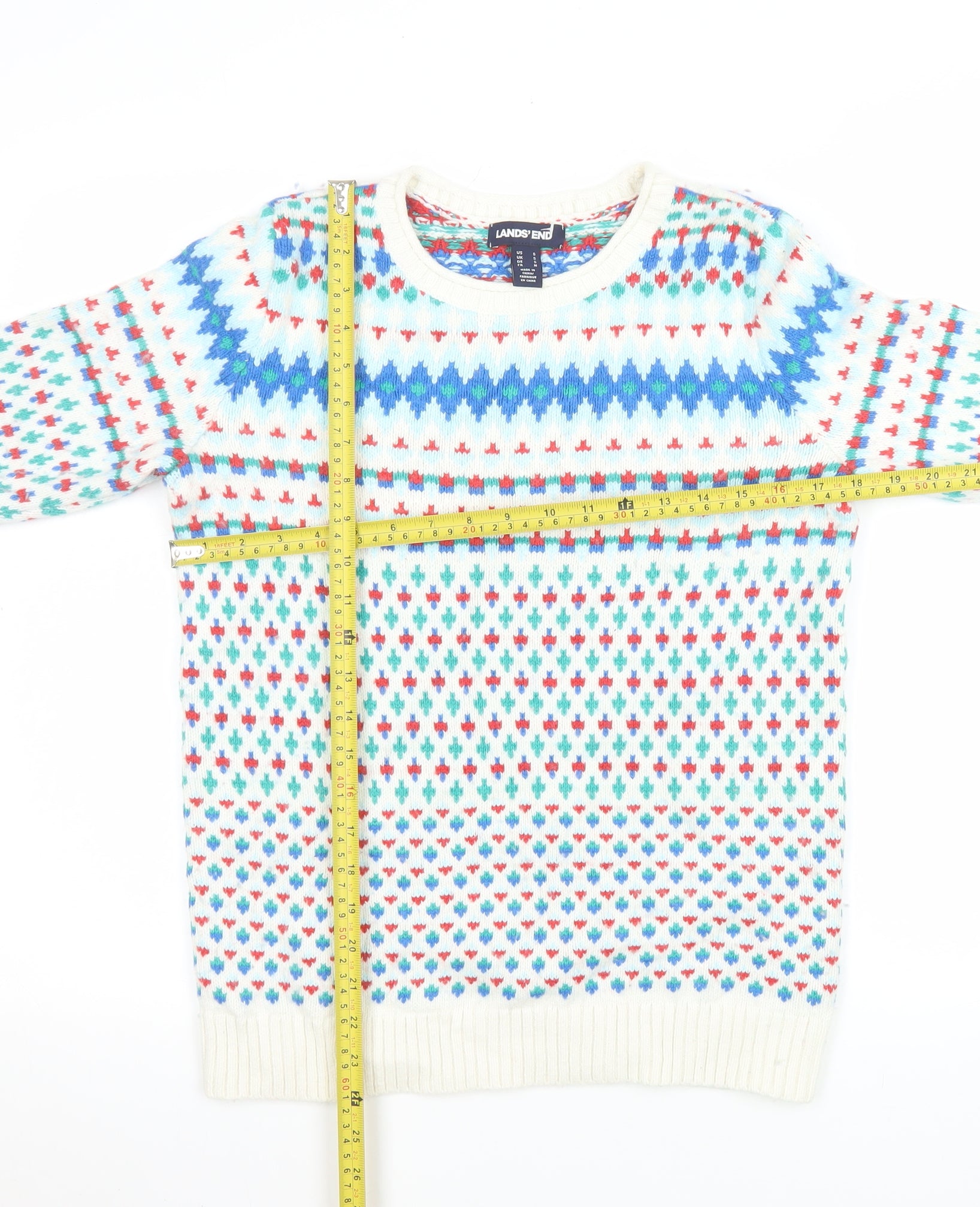 Bring classic winter charm to your wardrobe with this Lands' End men's multicoloured Fair Isle pullover jumper. Crafted from a soft and durable blend of 55% cotton, 25% nylon, 17% acrylic, and 3% wool, this sweater promises both comfort and warmth, making it ideal for autumn and winter wear. The Fair Isle pattern adds a timeless touch, blending shades of blue, red, green, and white for a distinctly festive yet stylish look that pairs beautifully with jeans or chinos. Designed for regular fit and all-season versatility, it offers a cosy yet breathable feel suitable for layering over shirts or under jackets. The crew neckline and ribbed hem and cuffs provide a classic silhouette that’s easy to wear and flattering for most body shapes. Perfect for casual days, travel, or relaxed weekends, this Lands' End jumper balances warmth with refined style. The fine knit construction ensures a neat finish, while the cotton-rich material keeps it lightweight and comfortable. The quality craftsmanship associated with Lands' End ensures lasting wear and dependable performance. This piece is machine washable for effortless care and retains its shape and colour even after multiple washes. Ideal for those who appreciate premium knitwear with a hint of traditional style, this pullover can easily transition from countryside strolls to laid-back evenings indoors. In excellent pre-loved condition, it shows minimal signs of wear and has been well maintained with no defects or notable flaws. A versatile and classic addition to any wardrobe, this jumper encapsulates timeless comfort and enduring appeal. Add it to your collection for an effortlessly stylish and cosy layer through the colder months.