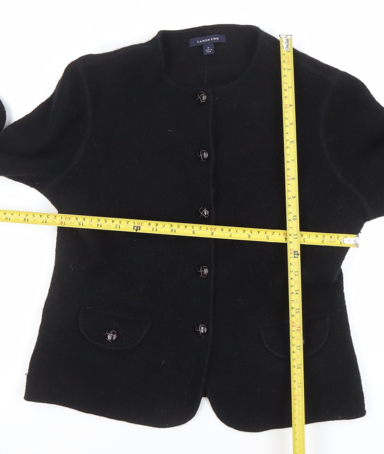 Elevate your wardrobe with this elegant black wool blazer from Lands' End, crafted to deliver both style and quality. Designed for women, this size 10 blazer is made from 100% wool, ensuring a premium feel and excellent warmth for the cooler months. Perfect for autumn and winter wear, the blazer is tailored in a mid-length cut that provides a flattering silhouette suitable for both business and casual occasions. The design features long sleeves, a button front closure, and two front flap pockets with buttons, creating a timeless and versatile look. The classic round neckline offers a sleek, modern touch that stands apart from traditional lapel collars, making it perfect for pairing with blouses, knits, or layered under coats. Subtle accents such as the beautifully stitched seams and soft wool texture add a refined, polished edge to any outfit. This piece embodies understated sophistication, ideal for professional settings, smart casual outings, or dinner events. Whether worn over a dress, with formal trousers, or paired with jeans for a more relaxed ensemble, it transitions effortlessly from day to night. The wool construction makes it warm yet breathable, while the precision tailoring provides a comfortable regular fit that enhances your natural shape without feeling restrictive. Maintained in excellent condition with minimal signs of previous wear, this Lands' End blazer promises long-lasting quality and enduring style. Priced affordably, it’s the perfect addition to your wardrobe if you value premium craftsmanship and timeless design. Treat yourself to a piece that blends classic elegance with everyday practicality—this black wool blazer will remain a wardrobe essential for years to come.