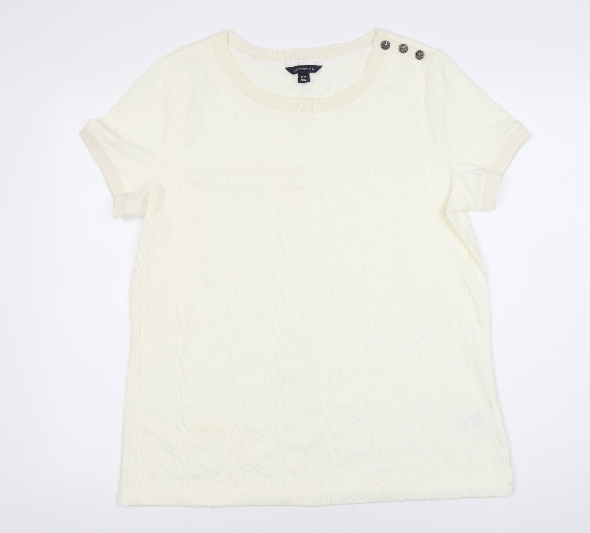 Embrace comfort and timeless style with this Lands’ End Women’s Ivory Knit Top. Designed for casual occasions, this top features a classic crew neckline and short sleeves, perfect for spring and summer outings. The subtle button accents on the shoulder add a charming detail to this solid pattern piece. Made from a luxurious blend of cotton, nylon, and elastane, the top offers a soft touch against the skin and a flexible fit. Its knit fabric type ensures breathability, making it an ideal choice for warm days. Though pre-loved, this top is in good condition with only slight discolouration at the front, barely noticeable and easy to pair with various bottoms. It promises a regular fit, enhancing both comfort and style. Easy to care for, simply machine wash to keep it looking fresh. Whether for a casual day out or a relaxed office set-up, this Lands’ End top is an elegant addition to any wardrobe.