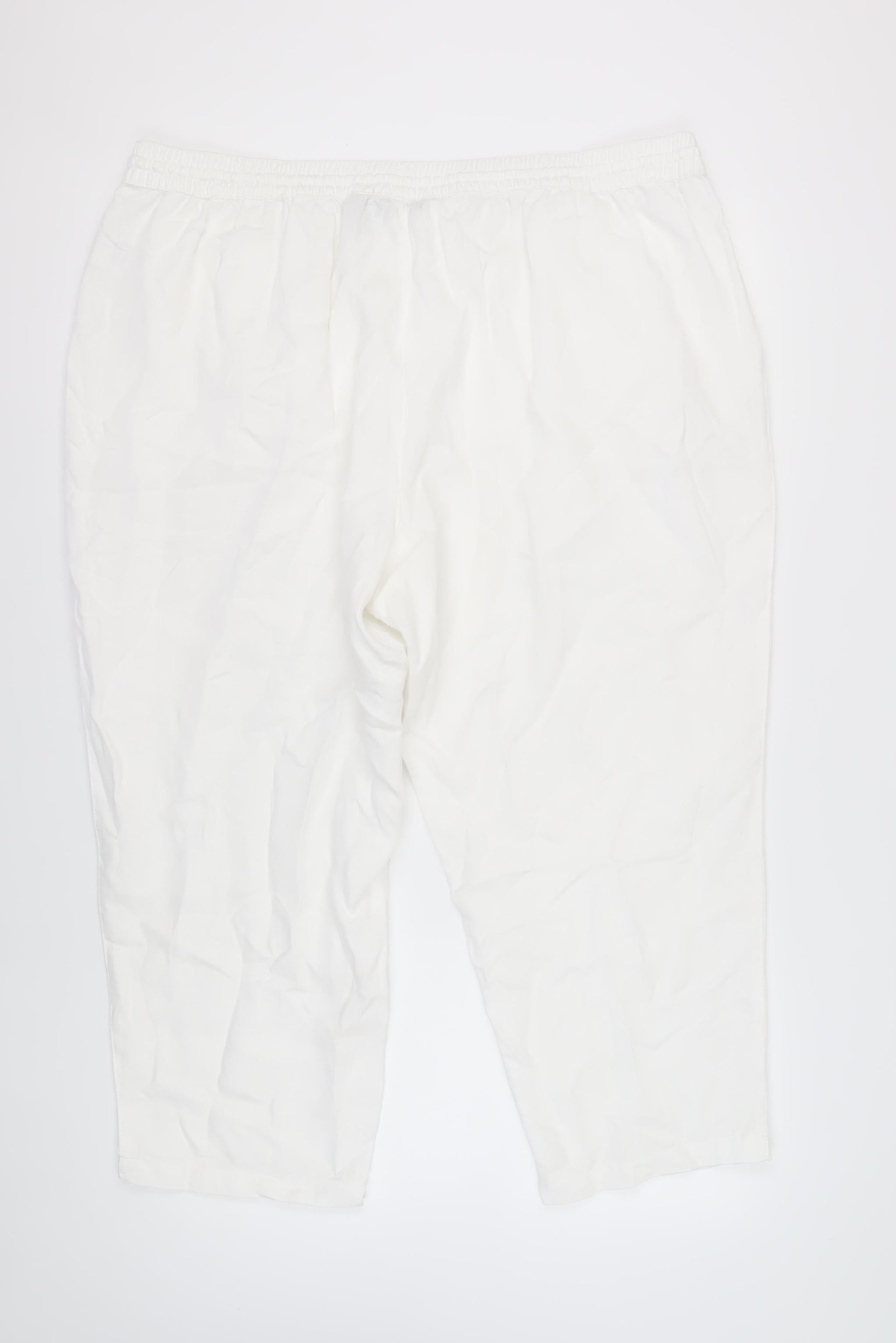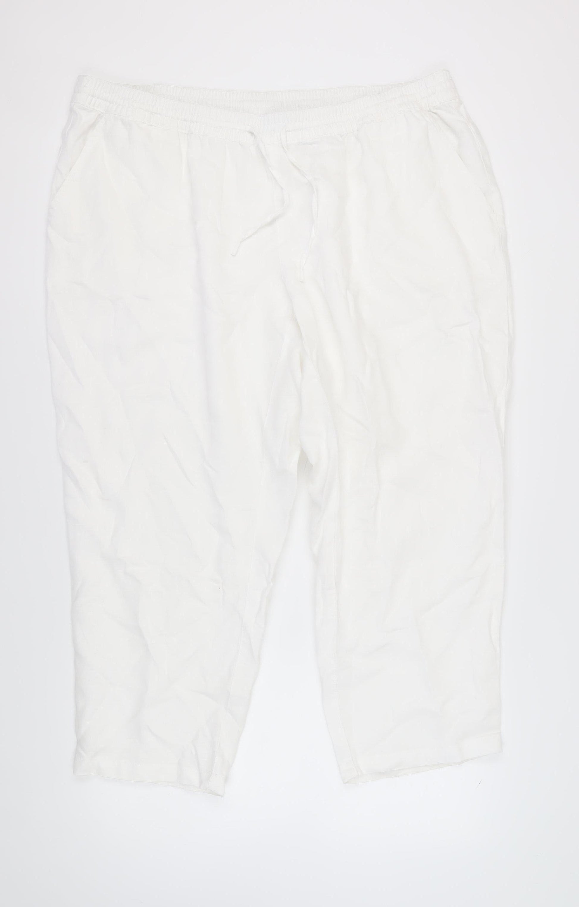 Embrace the light and airy feel of summer with these Lands' End Women's Plus Size White Linen Trousers. Crafted with 100% linen, these trousers offer unmatched breathability and comfort, making them a perfect choice for casual outings and relaxing days. The relaxed fit ensures ease of movement, while the mid-rise design offers a flattering and comfortable silhouette. The elastic waist coupled with a drawstring provides a secure fit, allowing for an adjustable and snug wear. Equipped with pockets, these trousers add functionality without compromising style. The crisp white colour provides a versatile base that easily pairs with your favourite tops and footwear. Machine washable for your convenience, these trousers promise easy care and maintenance. Ideal for warm summer days, these trousers blend simplicity with comfort, making them a wardrobe staple you'll reach for again and again. Whether for a leisurely walk by the beach or a casual day out, these trousers embody effortless style and practicality.