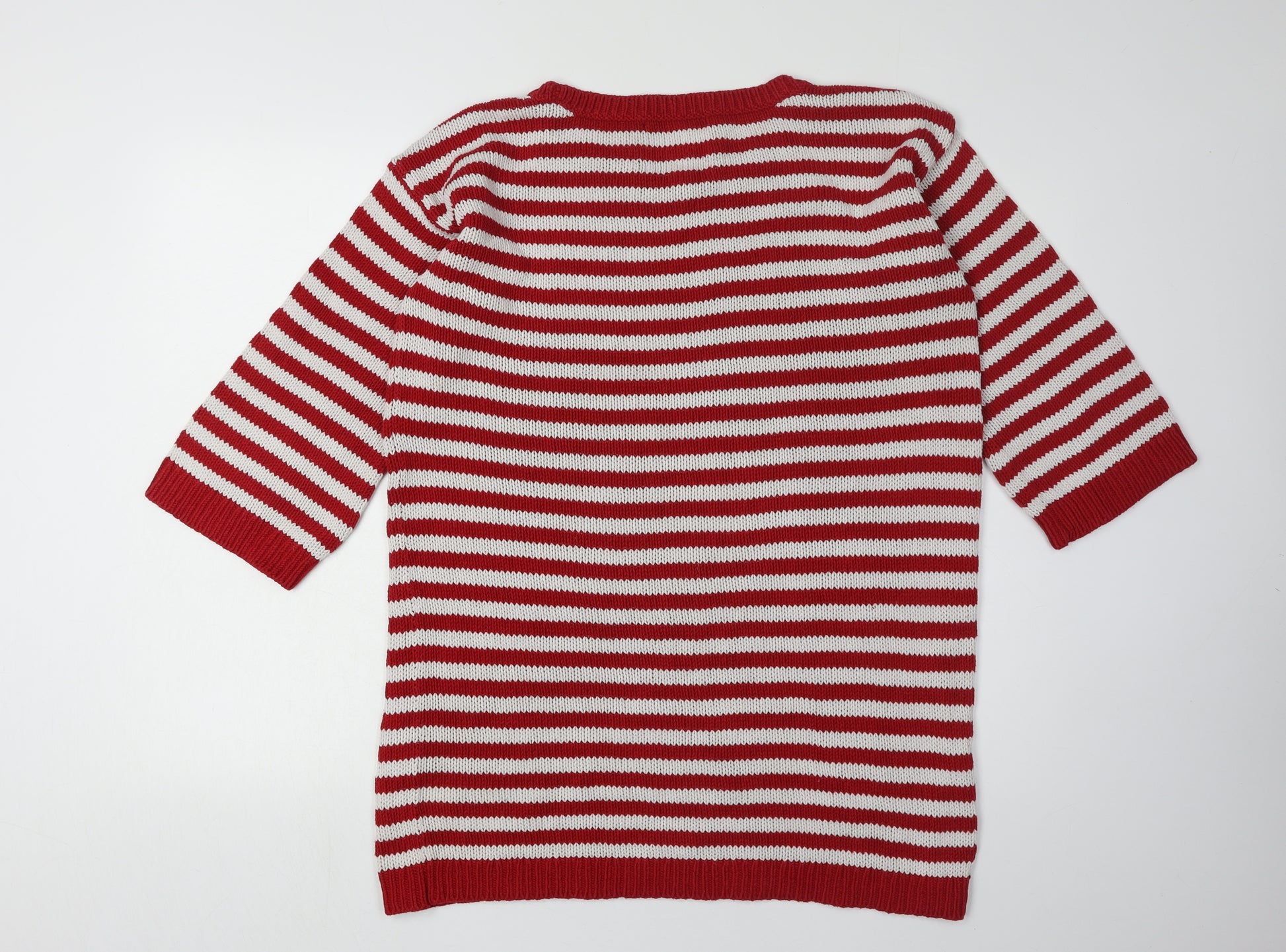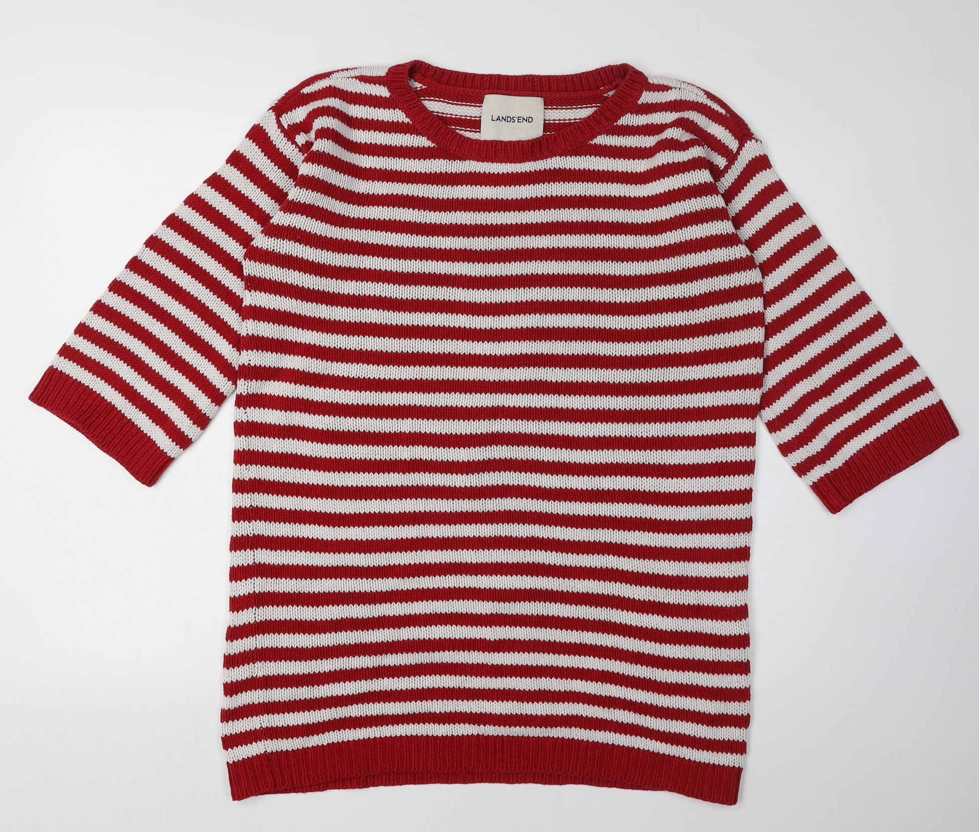 Capture a classic yet playful look with this Lands' End Women's Striped Pullover Jumper. Perfect for casual outings, this medium-sized jumper features a vibrant red and white striped pattern that makes a bold statement. Crafted from a comfortable blend of cotton and acrylic, this knit jumper offers softness and flexibility, ensuring comfort throughout the day. The crew neck design is both timeless and flattering, while the 3/4 sleeves provide a stylish touch that's perfect for changing weather conditions. Whether you're meeting friends for coffee or heading to a casual luncheon, this jumper is versatile enough to suit a variety of occasions. Pair it with your favourite jeans or a chic skirt to complete the look. In excellent condition, with no visible wear or damage, this jumper is a fantastic addition to any wardrobe. Embrace the combination of style and comfort and make this Lands' End pullover your go-to choice for casual outings.
