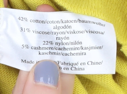 Brighten up your wardrobe with this delightful Laura Ashley women's Henley jumper. A vibrant yellow knit in a comfortable size UK 14, this jumper is perfect for casual occasions in both autumn and spring. The V-Neck design adds a stylish touch, while the long sleeves provide warmth on cooler days. Featuring a luxurious blend of cotton, viscose, nylon, and a touch of cashmere, this jumper offers a soft and comfortable fit. Though it shows some minor marks, it still holds its charm and quality. Pair this piece with your favourite jeans or a skirt for a chic and relaxed look. A wonderful addition to any wardrobe for those who love a pop of colour and timeless design.