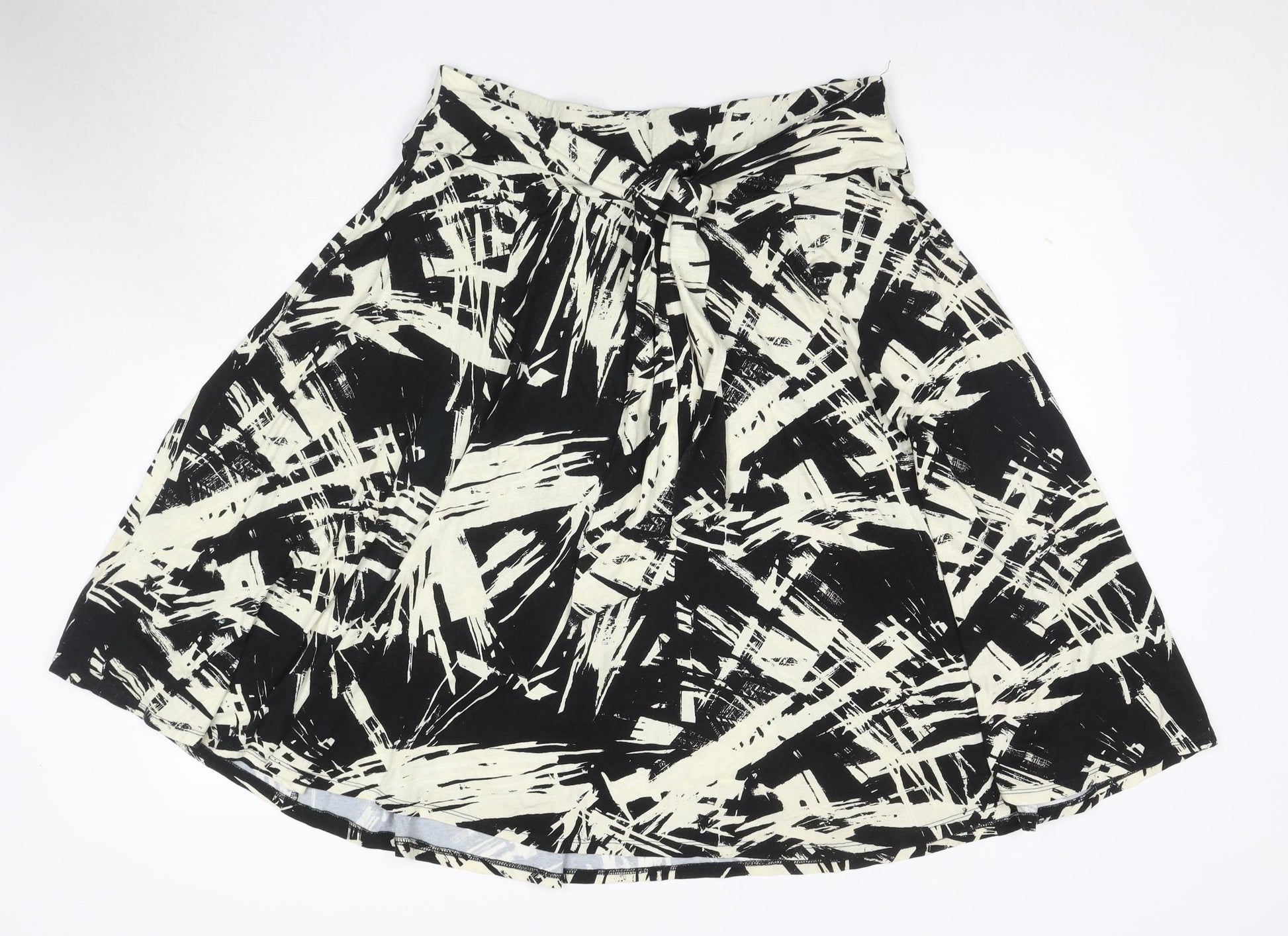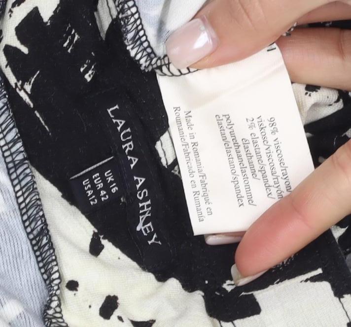 Enhance your wardrobe with this elegant Laura Ashley women's black geometric A-line skirt in size 16. Crafted from a smooth viscose-elastane blend, this knee-length skirt offers both comfort and style. The striking black and white geometric pattern adds a touch of contemporary flair, making it an ideal choice for both casual outings and more formal occasions. Featuring a classic A-line silhouette, this skirt is designed for ease of movement, providing a flattering fit for any body type. Its mid-rise design ensures a comfortable fit around the waist, while the zip closure adds practicality without sacrificing style. Perfect for all seasons, this versatile skirt can be dressed up with a tailored blouse and heels or worn casually with a simple tee and sneakers. Machine washable and easy to care for, it's a must-have addition to any fashion-forward wardrobe. Despite lacking original sales tags, it remains in excellent condition, showcasing Laura Ashley's timeless elegance and quality craftsmanship. Don't miss out on this fabulous piece that seamlessly blends vintage charm with modern aesthetics.