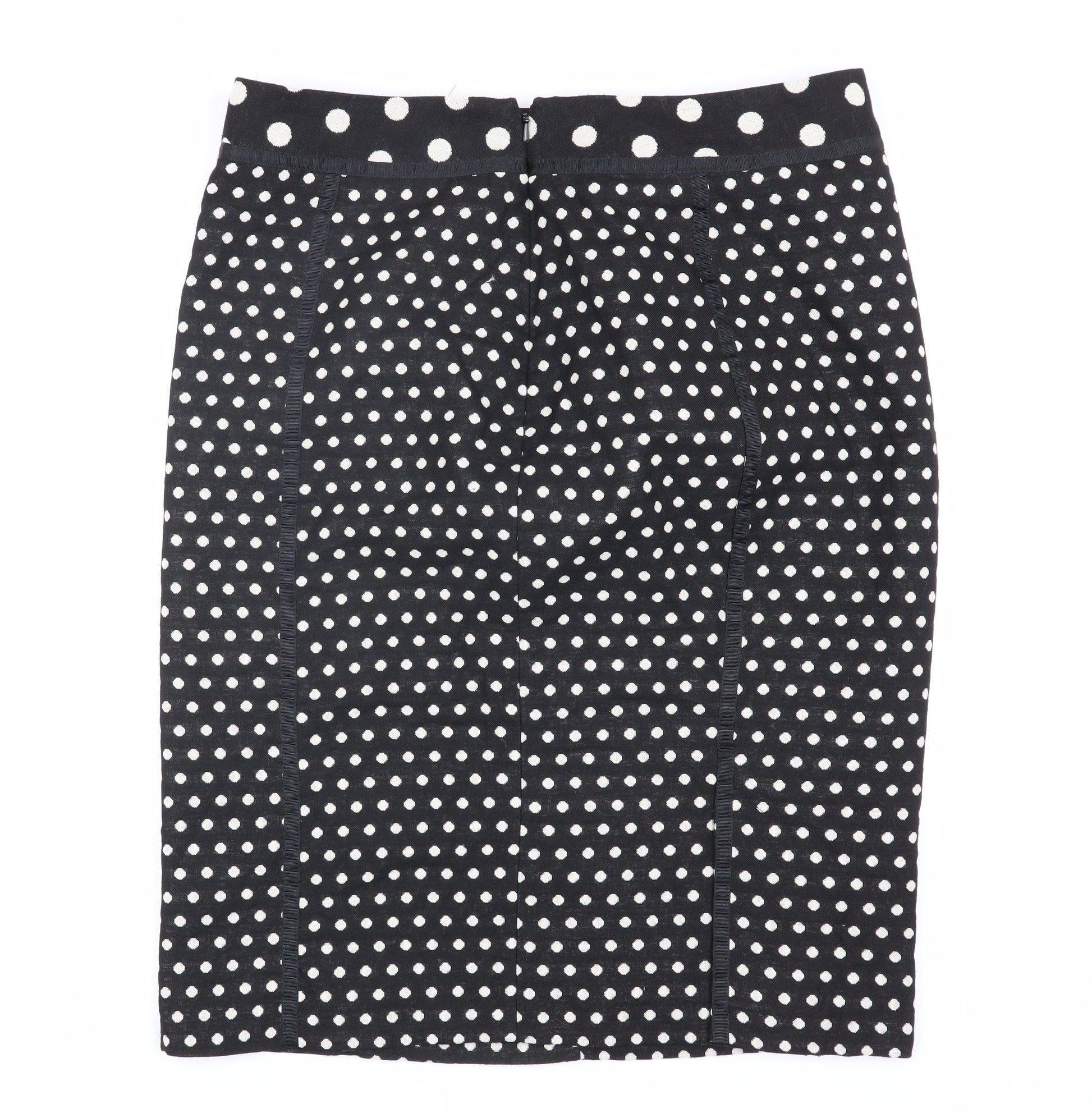 Step out in style with this charming Laura Ashley women's pencil skirt, beautifully adorned with an eye-catching polka dot pattern in a classic black colour. Crafted from a soft blend of cotton, polyester, and viscose, this skirt offers both comfort and sophistication, making it a versatile addition to any wardrobe. Designed to enhance your silhouette, its straight and pencil style with a knee-length cut exudes elegance and grace. Ideal for various occasions, whether it's a casual day out or a professional work setting, this skirt is sure to elevate your fashion game. The convenient zip closure ensures a snug fit, while the gentle construction promises an enjoyable wear all day long. Timeless, chic, and sophisticated, it is perfect for those who appreciate subtle beauty and timeless patterns. Pair it with a crisp white blouse for a polished office look or a casual tee for a relaxed vibe. The impeccable condition of this skirt makes it a must-have for fashion enthusiasts looking for a reliable yet stylish piece. Embrace effortless elegance with this quintessential polka dot skirt and let your wardrobe reflect your taste for quality and style.