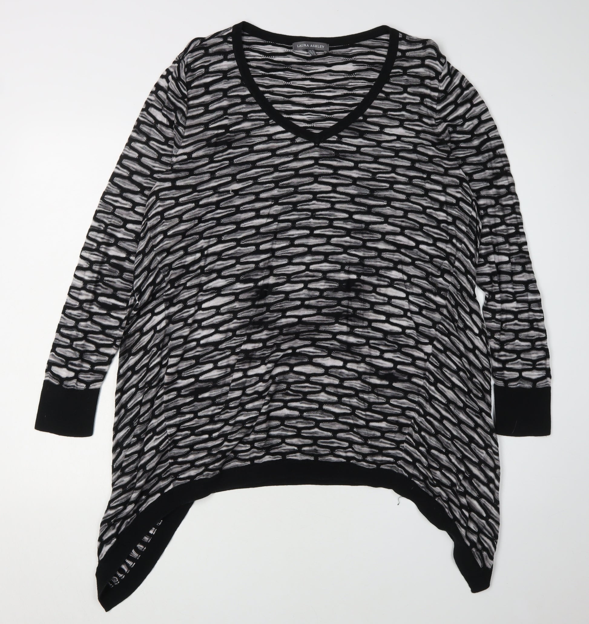 Step into comfort and style with this Laura Ashley Women's Black V-Neck Pullover Jumper, perfect for casual outings and understated elegance. Crafted from a soft blend of cotton and viscose, the knit fabric offers a comfortable and breathable fit ideal for everyday wear. The relaxed fit design, accentuated by a chic V-neckline, adds a subtle touch of sophistication, while the long sleeves provide ample coverage for cooler days. Styled in a black geometric pattern, this jumper effortlessly complements any outfit, making it a must-have staple for your wardrobe. Ideal for all seasons, the jumper offers versatile appeal—from pairing with your favourite jeans for a day out to dressing up with accessories for a cozy evening in. Its machine-washable fabric ensures easy care, adding to the convenience and longevity of this piece. Whether you're heading to a casual meeting or lounging at home, this jumper combines functionality with fashion. Embrace the blend of practicality and style with this classic pullover, and make it the standout piece of your casual collection. Add a touch of classic elegance to your ensemble with this beautifully crafted Laura Ashley jumper.