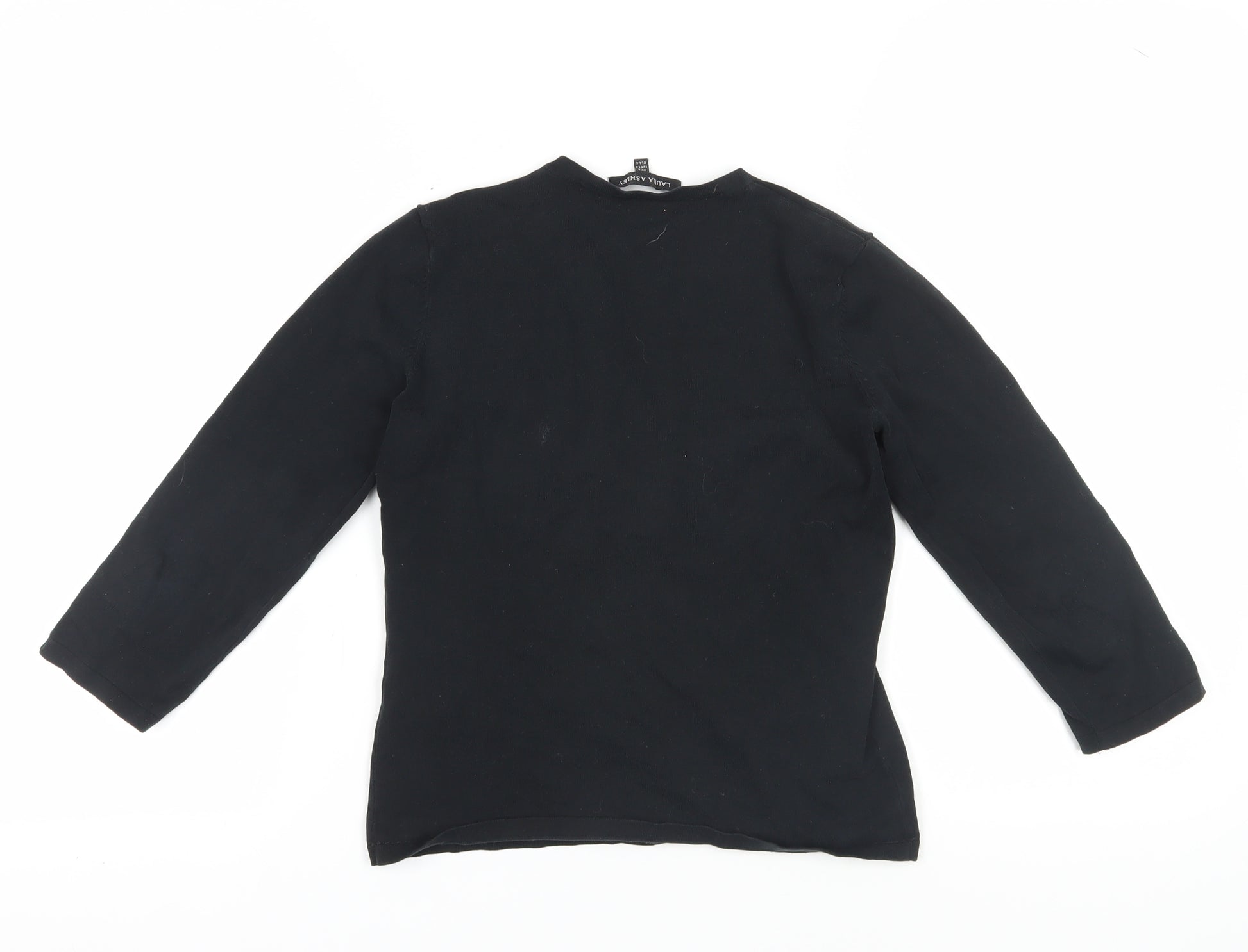 Elevate your wardrobe with this elegant Laura Ashley top, designed for versatile styling. This black V-neck top is crafted from a comfortable blend of cotton, nylon, and elastane, ensuring a soft and stretchy fit. It features a flattering 3/4 sleeve length and a classic solid pattern, making it an ideal choice for both casual and more formal occasions. With its sleek button accents and regular fit, this top offers both style and functionality. Suitable for autumn and spring, it’s easy to care for with a machine-washable fabric. Perfect for the modern woman seeking a blend of comfort and sophistication.