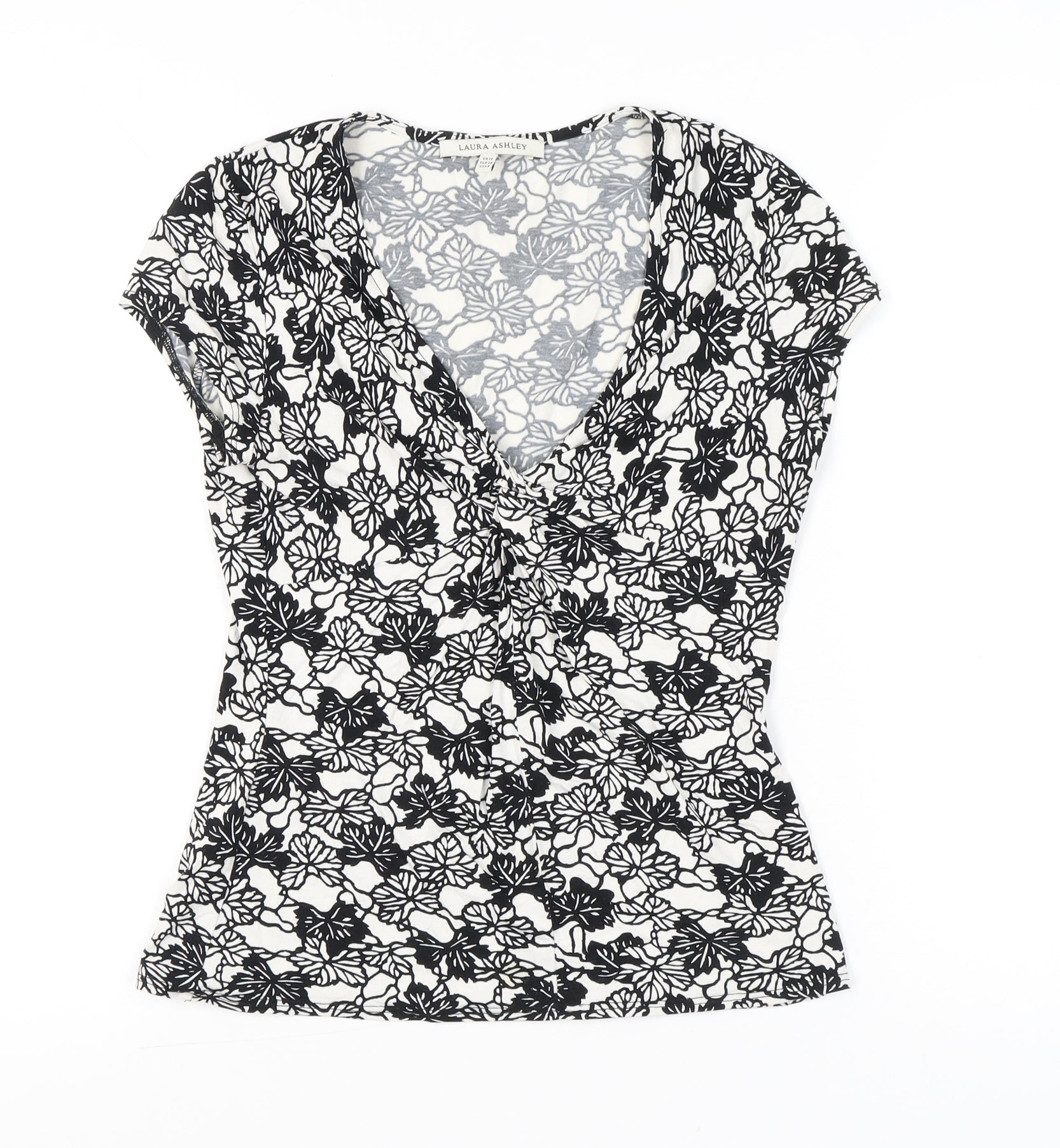 Discover timeless elegance with this beautiful Laura Ashley women's blouse, designed to bring both effortless comfort and style to your wardrobe. Presented in a chic black and white floral print, this piece has a striking eye-catching finish that is versatile for a wide range of occasions. Cut from a premium blend of 98% viscose with 2% elastane, the fabric is soft, breathable, and lightweight, offering a flattering drape on the body with just the right amount of stretch to ensure ease of movement and a comfortable fit throughout the day. Styled with a wrap-effect V-neckline, the blouse effortlessly creates a feminine and flattering silhouette while maintaining a sophisticated overall look. The cap sleeves add to its easy-going design, making this blouse suitable for warmer months and ideal for layering under jackets or cardigans during spring and autumn. Its regular fit ensures a comfortable wear, enhanced by the flow of the viscose jersey fabric which adapts beautifully to different body shapes.Practical for daily wear, this top is machine washable which makes it both stylish and low-maintenance. Featuring pullover styling, it is fuss-free and easy to wear, whether you are dressing up for work, an evening event, or looking for something graceful yet casual for daytime occasions. The black and white floral motif delivers a timeless design that can be styled with trousers, skirts, or jeans with equal ease – perfect for workwear, casual outings, or even party occasions when paired with complementary accessories.Condition is excellent, showing minimal previous use with no visible marks, snags, or defects. A versatile blouse of this quality and design makes a fabulous addition to any wardrobe collection. With its combination of effortless elegance, premium fabrication, and stylish detailing, this Laura Ashley blouse is an investment piece that will continue to deliver wearability season after season.Enhance your outfits with this striking yet versatile Laura Ashley floral blouse – ideal for women seeking both comfort and refined style.