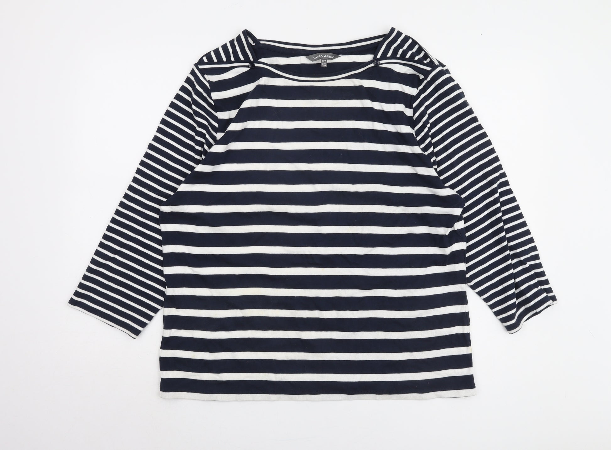 Add a touch of classic style to your wardrobe with this Laura Ashley women's striped T-shirt. Made from 100% cotton, it promises comfort and breathability for everyday wear. The navy blue and white stripes lend a timeless nautical theme, making it perfect for casual outings in autumn and spring. Designed with a boat neckline and regular fit, this piece enhances your silhouette while providing relaxed comfort. The 3/4 sleeves add a sophisticated touch, making it suitable for layering or wearing alone. Ideal for casual occasions, this T-shirt can be paired effortlessly with jeans or a skirt, offering versatile styling options. Its machine washable property ensures easy care, making it a practical yet stylish addition to any wardrobe.