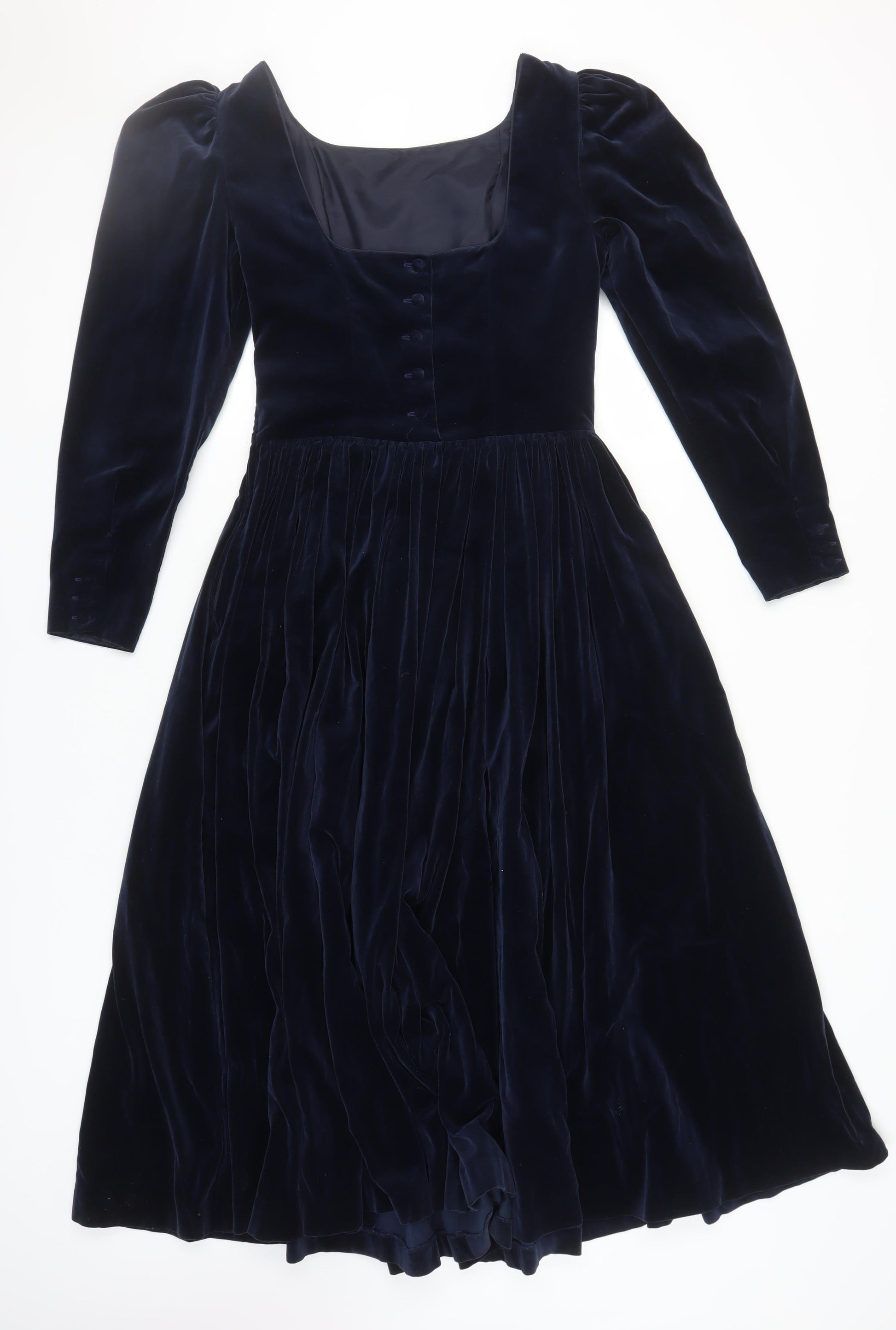 Indulge in timeless elegance with this Laura Ashley Women's Blue Velvet Dress. Crafted from 100% cotton, this luxurious piece offers both comfort and sophistication. The rich blue hue radiates a classic charm, while the soft velvet fabric ensures you stand out effortlessly. This dress features long sleeves with stylish puff designs, adding a touch of drama to the overall look. The square neckline exudes a poised and refined aura, and the button closure at the back keeps it secure yet stylish. Designed for the modern woman, this dress is an ideal choice for casual occasions or a relaxed evening outing. The regular fit complements the natural curves, offering a flattering silhouette for size UK 12. Despite its excellent condition with no visible signs of wear or damage, this dress is available at an attractive price. Make a statement this season with this elegant addition to your wardrobe.