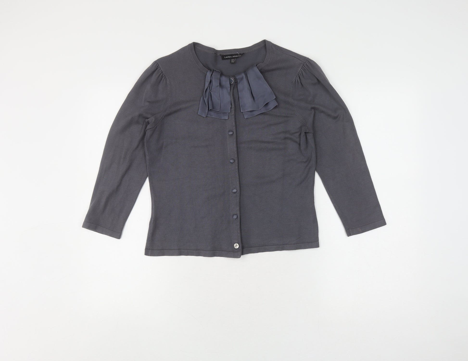 Elevate your wardrobe with this elegant Laura Ashley women's cardigan, perfect for casual outings and stylish comfort. Crafted with care, this grey cardigan features a sophisticated round neck with a charming bow accent, adding a touch of femininity to your look. The 3/4 puff sleeves provide an elegant silhouette, making it a versatile piece for autumn and winter layering. Styled in a regular fit, it ensures you stay comfortable throughout the day. The cardigan is made from a soft viscose blend, featuring nylon and elastane, delivering a breathable and flexible feel. Its lightweight knit style is enhanced by button accents for added sophistication. Pair it effortlessly with your favourite jeans or trousers for a timeless, chic ensemble. Whether heading to a casual day out or an evening gathering, this cardigan complements your style effortlessly. Enjoy the fashion-forward look with Laura Ashley's signature quality, and experience a garment that offers durability and elegance. Hand wash only to maintain the rich texture and colour vibrancy. Don't miss out on adding this exquisite piece to your collection.